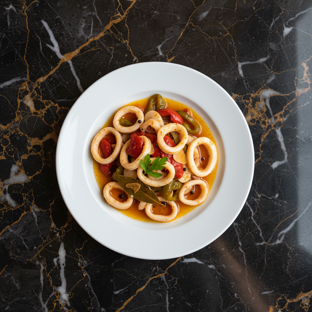 A classic Spanish tapa or appetizer, this dish features tender squid rings and sweet bell peppers preserved in a tangy, aromatic escabeche (vinegar-based marinade). It's a refreshing and flavorful dish, perfect served chilled or at room temperature.