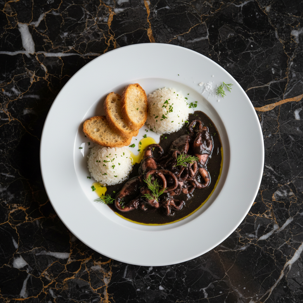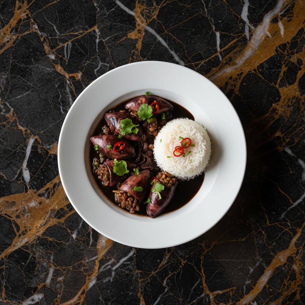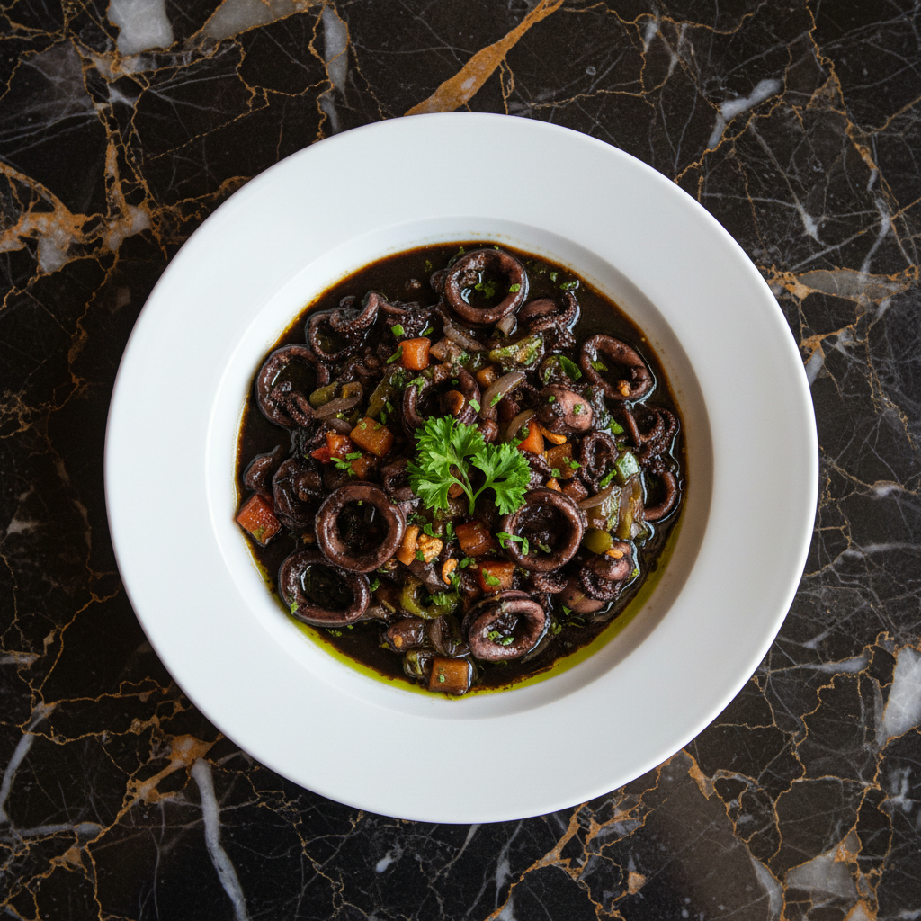 Tender squid simmered in its own ink with a sofrito of onions, peppers, garlic, and tomatoes, creating a rich, dark, and deeply flavorful sauce.