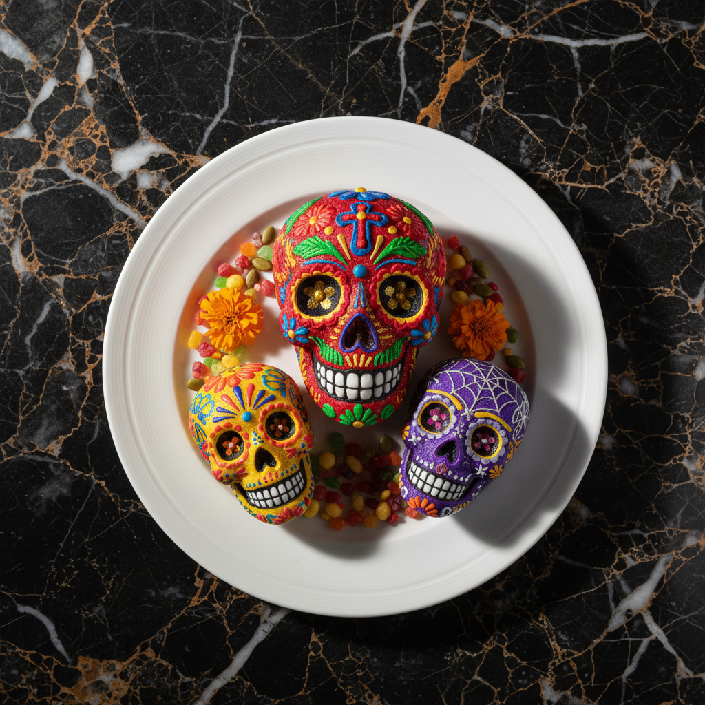 Decorative sugar skulls, a traditional edible folk art centerpiece for Day of the Dead (Día de Muertos) altars. These are primarily for decoration but can be eaten.