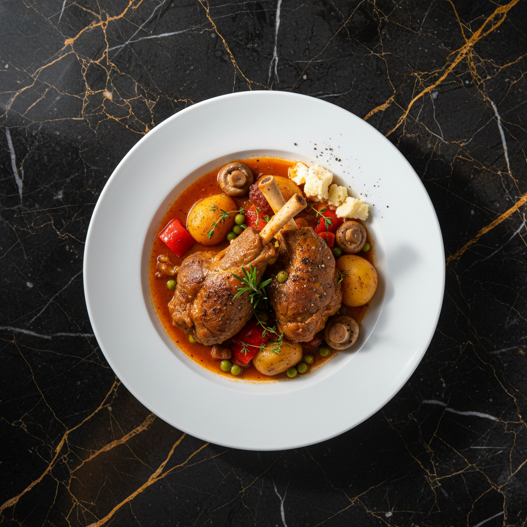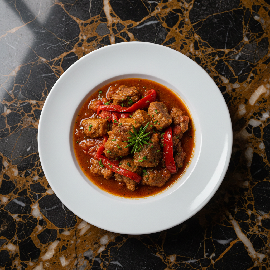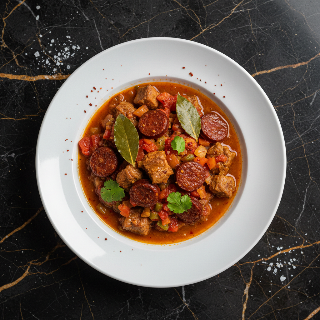 A rustic and deeply flavorful lamb stew originating from the La Rioja region, known for its rich culinary traditions. This dish features tender lamb simmered in a robust sauce with red peppers, tomatoes, and a hint of wine, embodying the hearty spirit of Spanish country cooking.