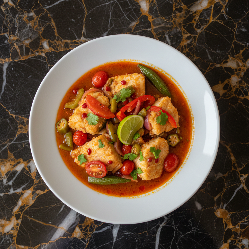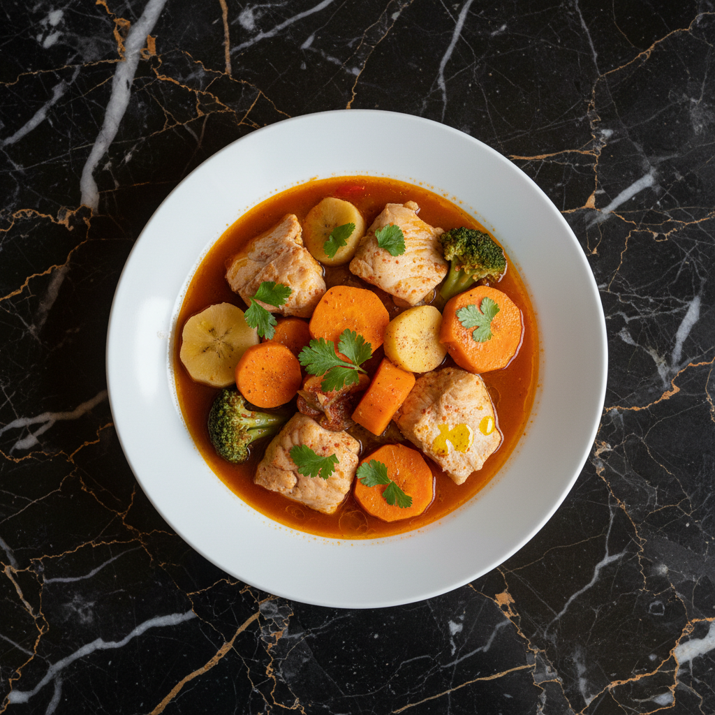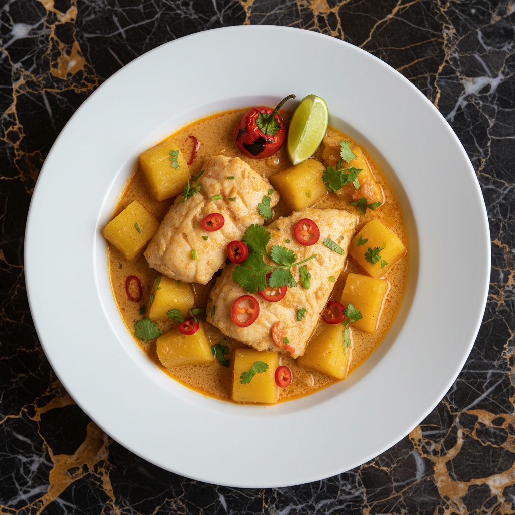 A flavorful fish stew cooked with cassava (mandioca) and enriched with creamy coconut milk, offering a taste of coastal Angolan cuisine.