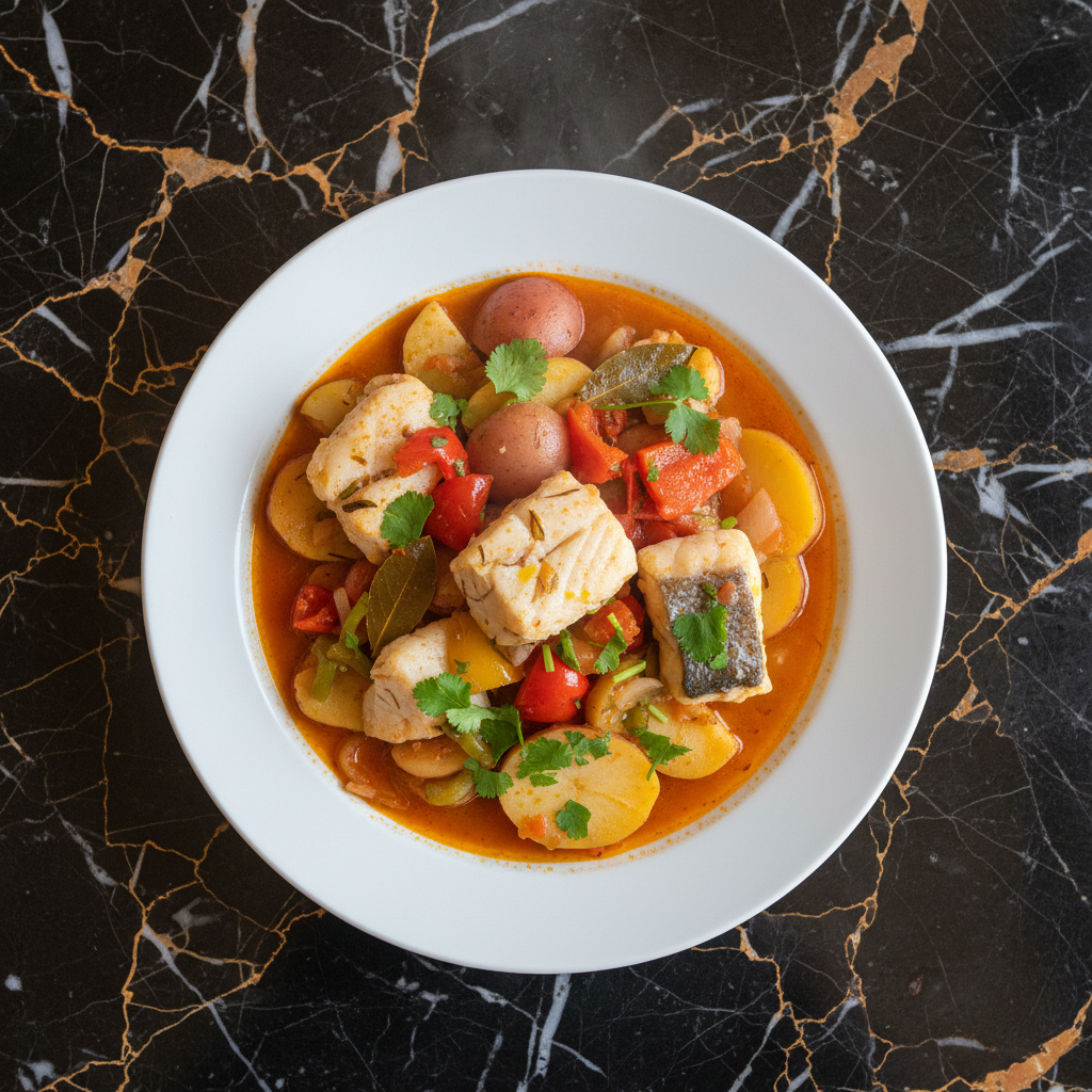 A hearty and traditional Portuguese fisherman's stew featuring layers of firm white fish, potatoes, onions, and tomatoes, gently simmered in white wine. The key is to avoid stirring, allowing the flavors to meld beautifully.