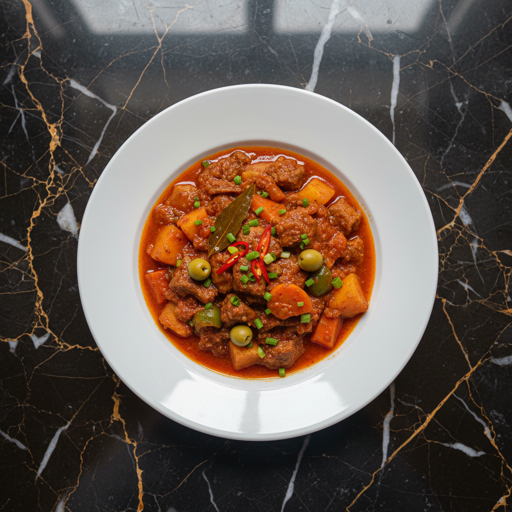 A rich and savory Filipino meat stew, traditionally made with goat or beef, simmered in a flavorful tomato and liver sauce. This hearty dish is a staple at Filipino fiestas and celebrations.