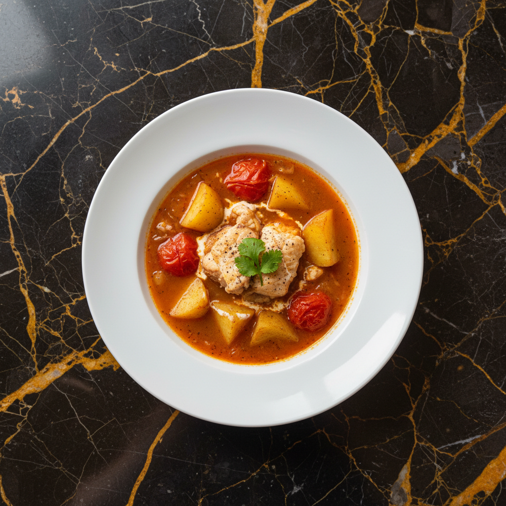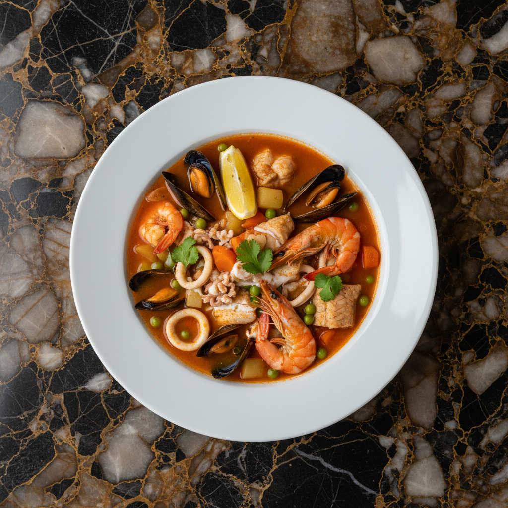 A rich and flavorful Chilean conger eel soup, featuring tender pieces of fish in a savory broth with potatoes, tomatoes, and a hint of white wine. A poetic favorite, famously celebrated by Pablo Neruda.
