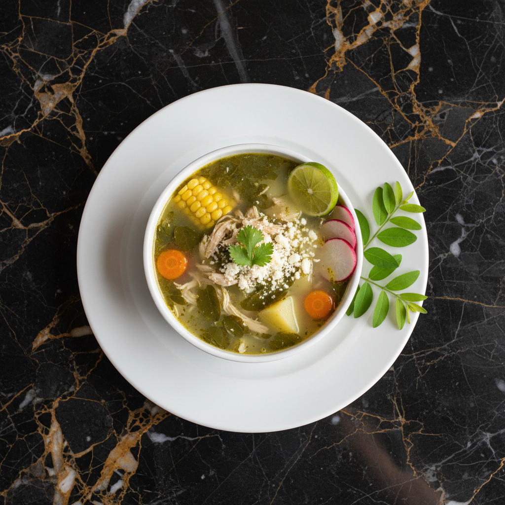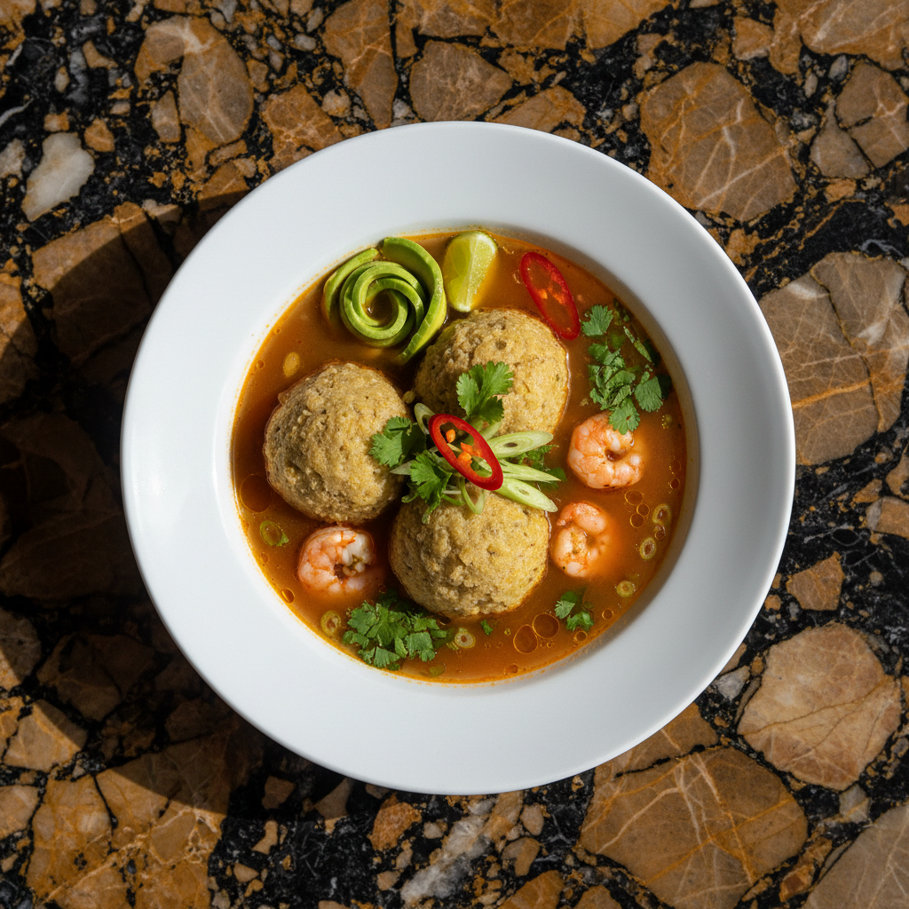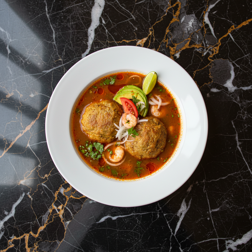 A hearty and flavorful soup featuring tender green plantain balls (bolas de verde) filled with succulent shrimp, simmered in a rich, aromatic broth. This dish is a comforting and classic representation of Ecuadorian coastal cuisine.