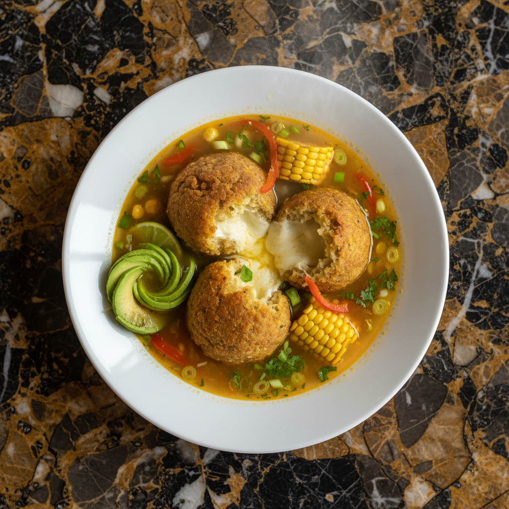 A hearty and flavorful soup featuring tender green plantain dumplings (bolas) filled with melted cheese, simmered in a rich broth with vegetables and herbs. This dish is a comforting and satisfying representation of Ecuadorian coastal cuisine.