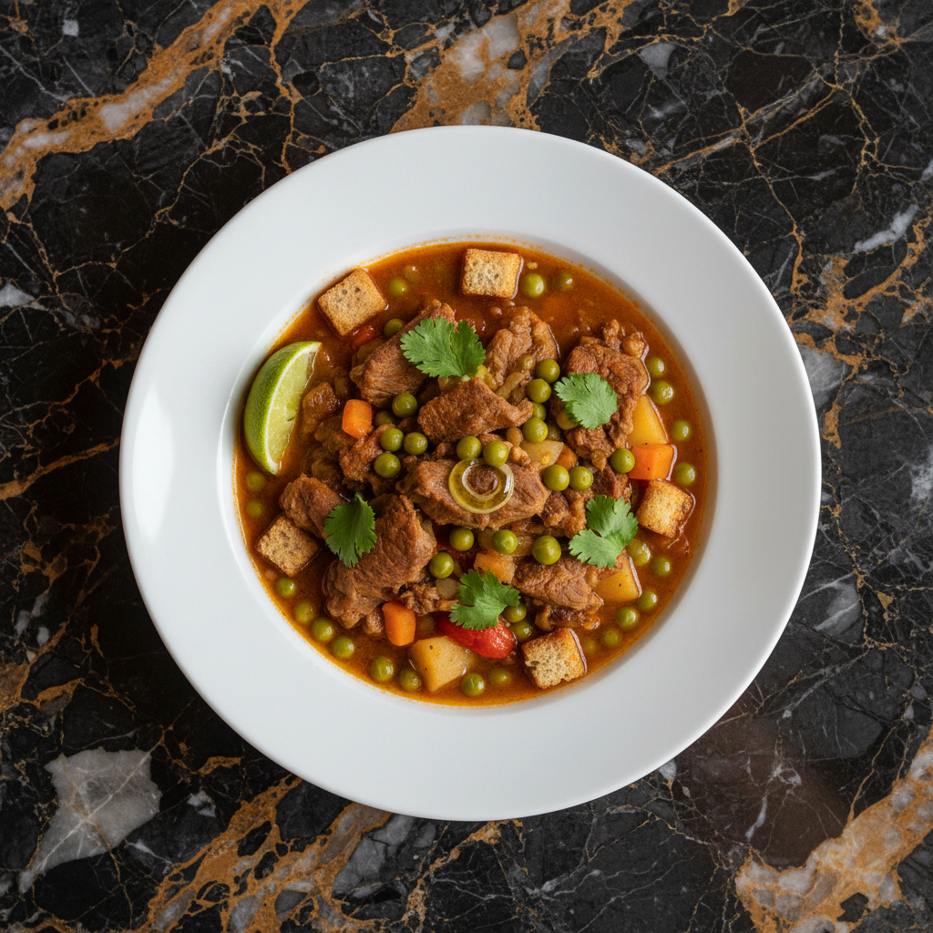 A hearty and flavorful goat stew with tender chunks of goat meat simmered in a rich broth with vegetables and peas, representing a less common but traditional regional specialty.