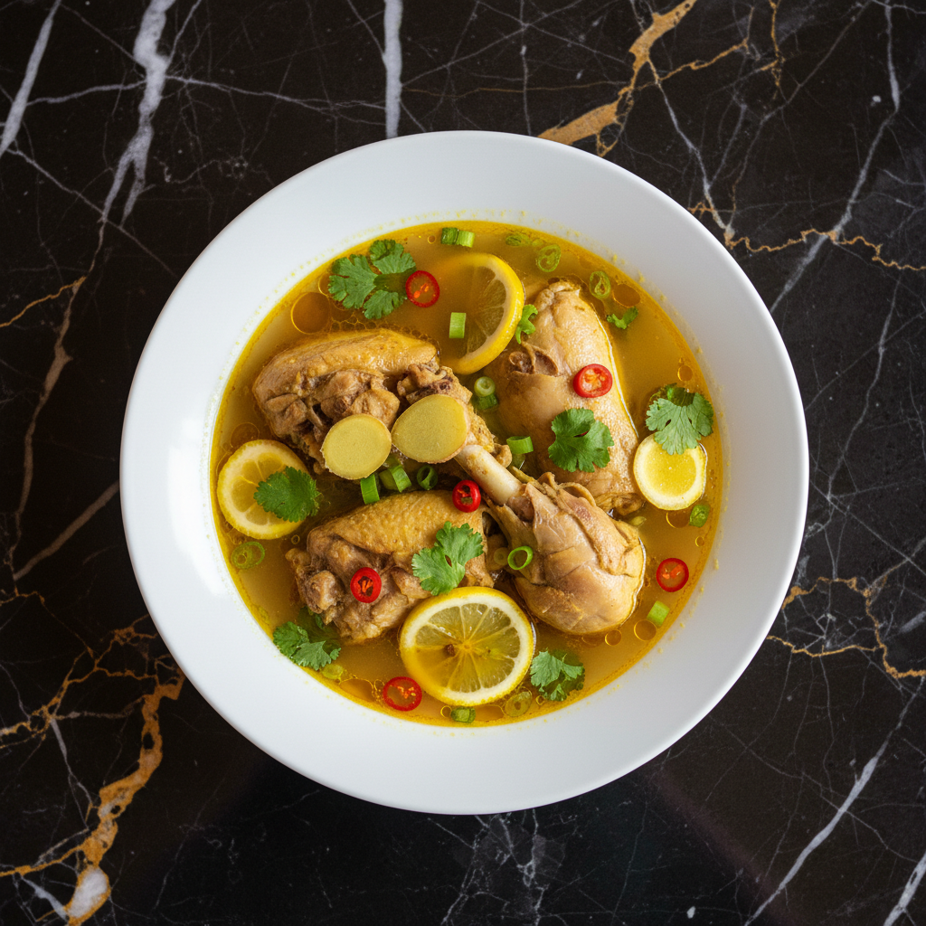 A comforting and flavorful chicken soup, enhanced with the zesty notes of ginger and lemon, often prepared for its nourishing properties.