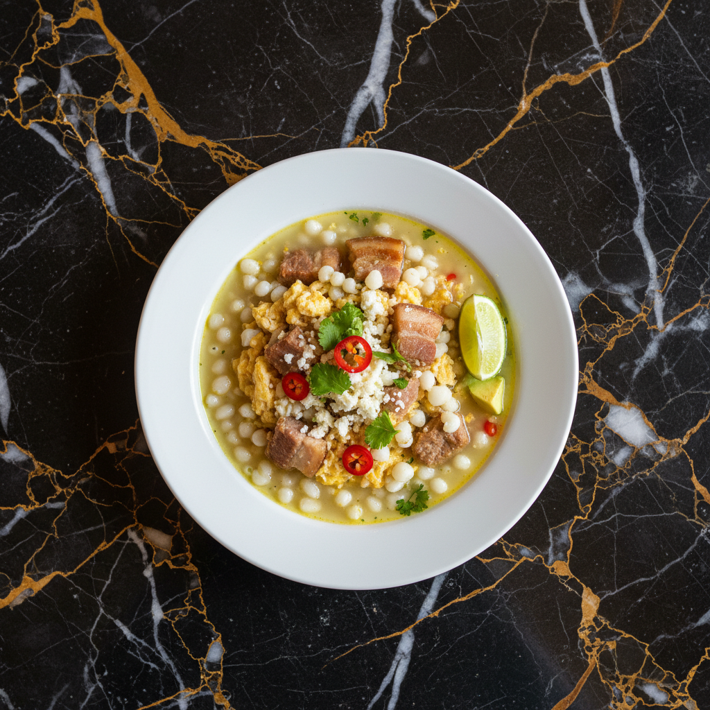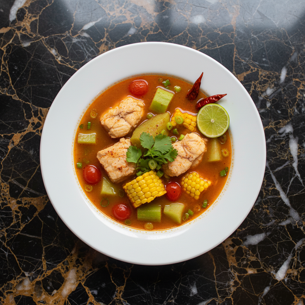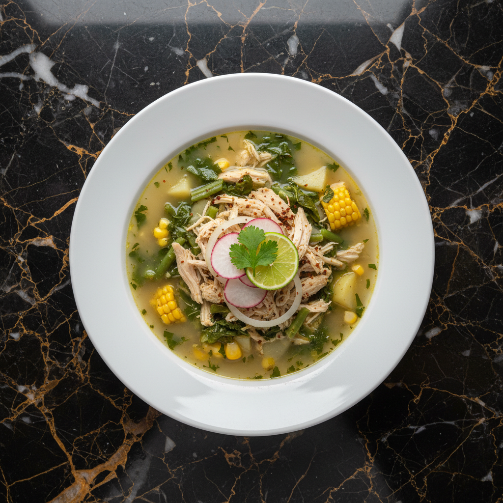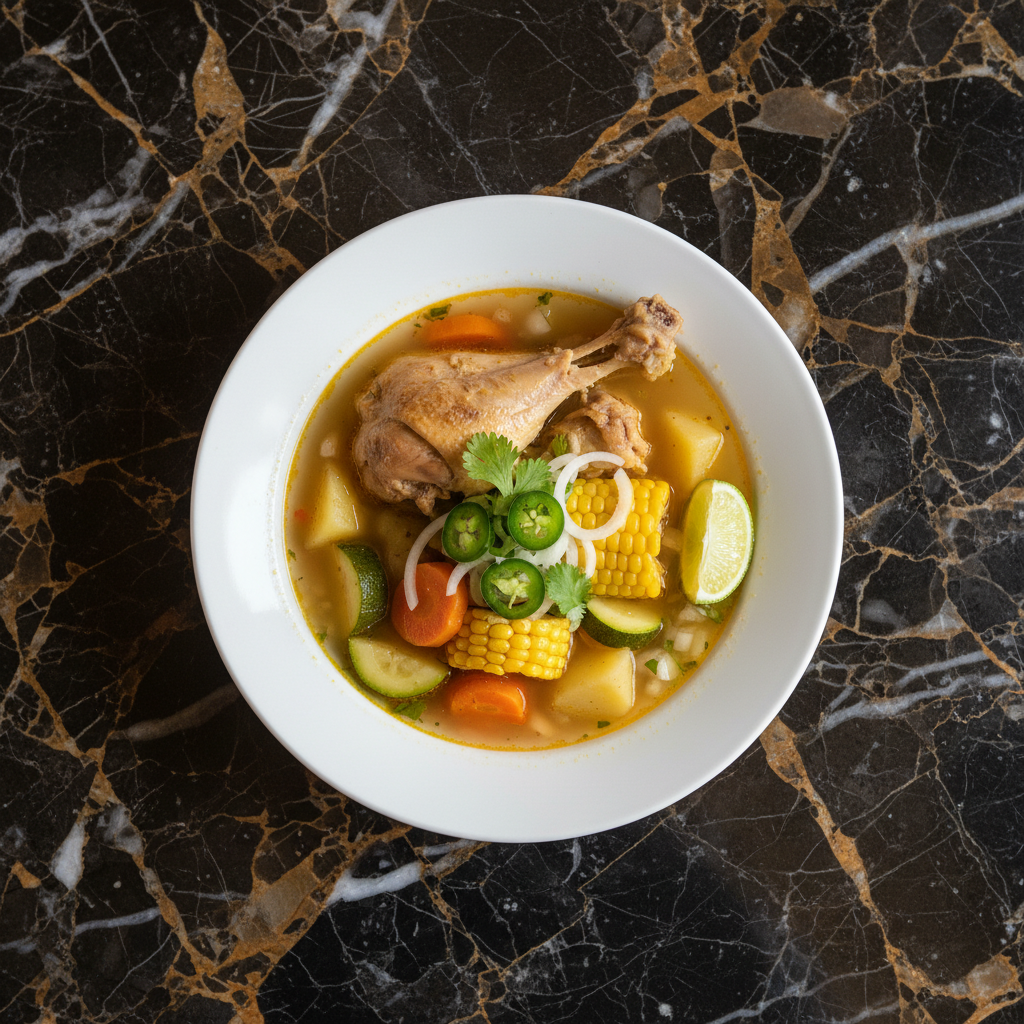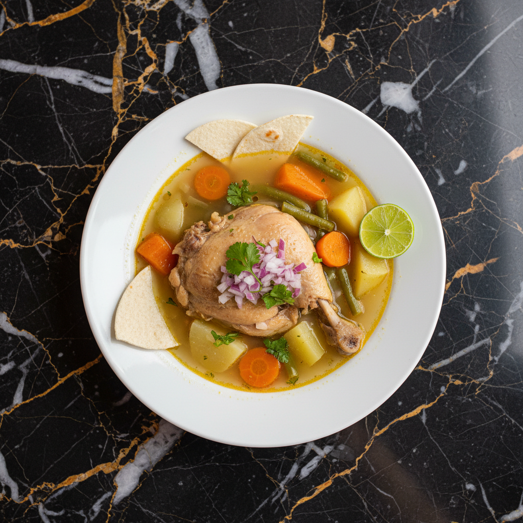 A comforting and nourishing Mexican chicken soup, often considered a cure-all. A whole chicken is simmered with aromatic vegetables and spices, then combined with hearty vegetables like carrots, potatoes, chayote, and corn. Served with fresh garnishes, it's a soul-warming dish perfect for any occasion.