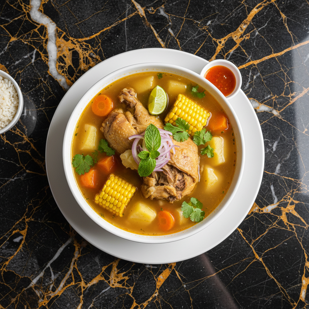 A hearty and flavorful soup made with free-range chicken (gallina criolla), vegetables, and herbs, often considered a restorative dish.