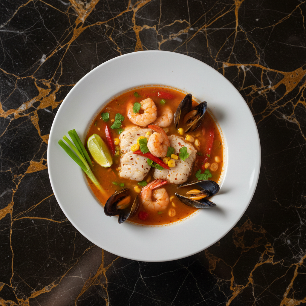 A rich and flavorful seafood soup, brimming with fresh fish, shrimp, and mussels in a savory tomato-based broth, seasoned with aromatic vegetables and a hint of spice. It's a comforting and celebratory dish often enjoyed on special occasions.