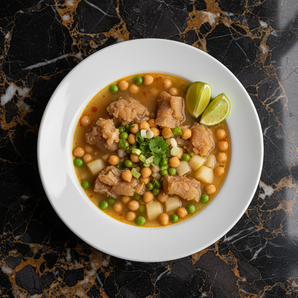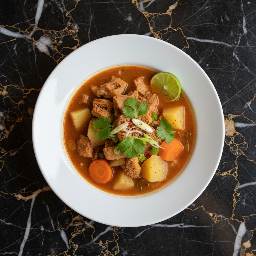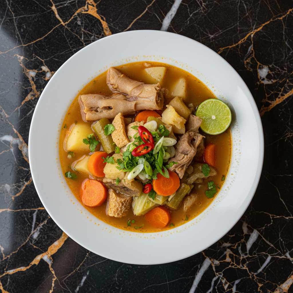 A hearty and flavorful soup made from cow's feet, vegetables, and spices. It's known for its rich broth and tender meat, often considered a delicacy and a restorative dish.