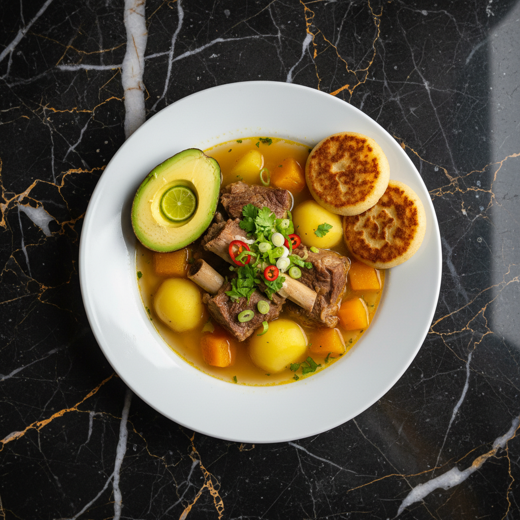 A deeply comforting and hearty Colombian breakfast soup featuring tender beef ribs, soft potatoes, and aromatic herbs. Perfect for a chilly morning or as a restorative meal.