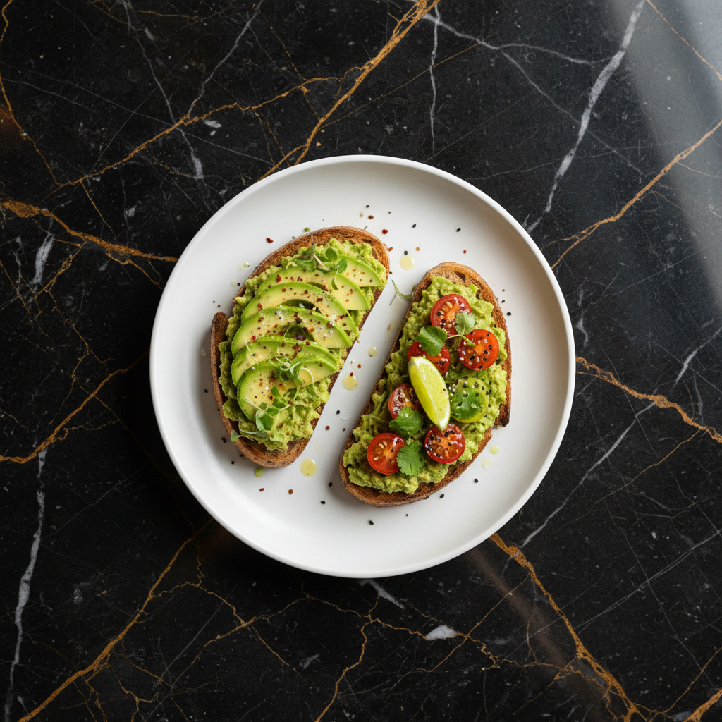 A classic and vibrant dish featuring perfectly smashed avocado on toasted sourdough, elevated with fresh lime, a hint of spice, and your favorite toppings. A quintessential California brunch staple.