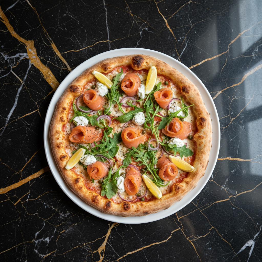 A gourmet pizza inspired by Wolfgang Puck's innovative creations, featuring a delicate balance of smoked salmon, tangy crème fraîche, sharp red onion, and briny capers, finished with fresh dill. This recipe offers a lighter, more sophisticated take on traditional pizza.