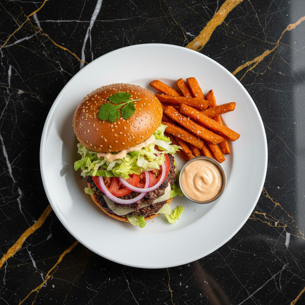 Thin, crispy-edged patties with a tangy special sauce and fresh, crisp toppings, all nestled in a soft, toasted bun. A taste of West Coast fast food perfection.