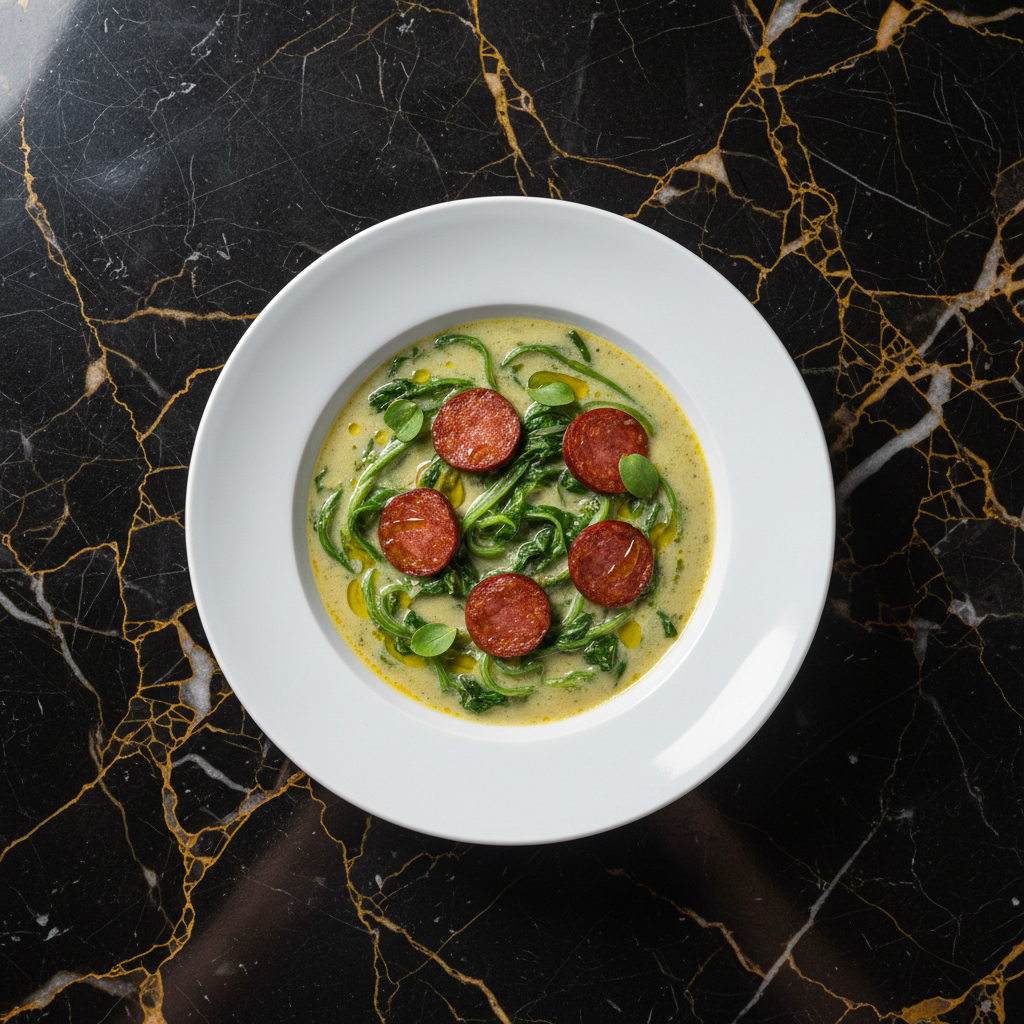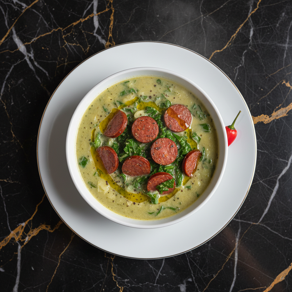 A hearty and comforting Brazilian kale soup, a beloved dish with Portuguese roots. This version features tender potatoes blended into a creamy base, wilted collard greens, and savory calabresa sausage.
