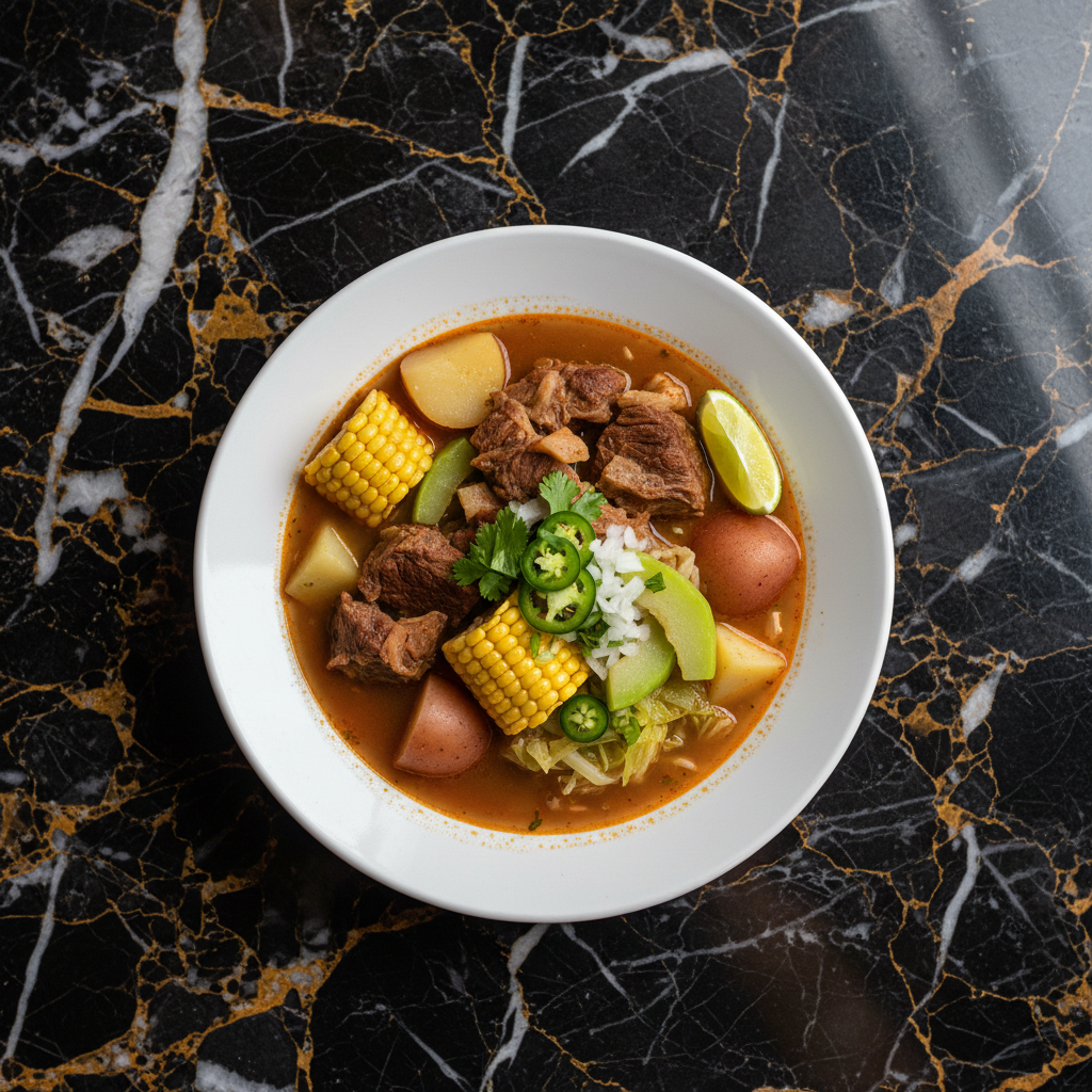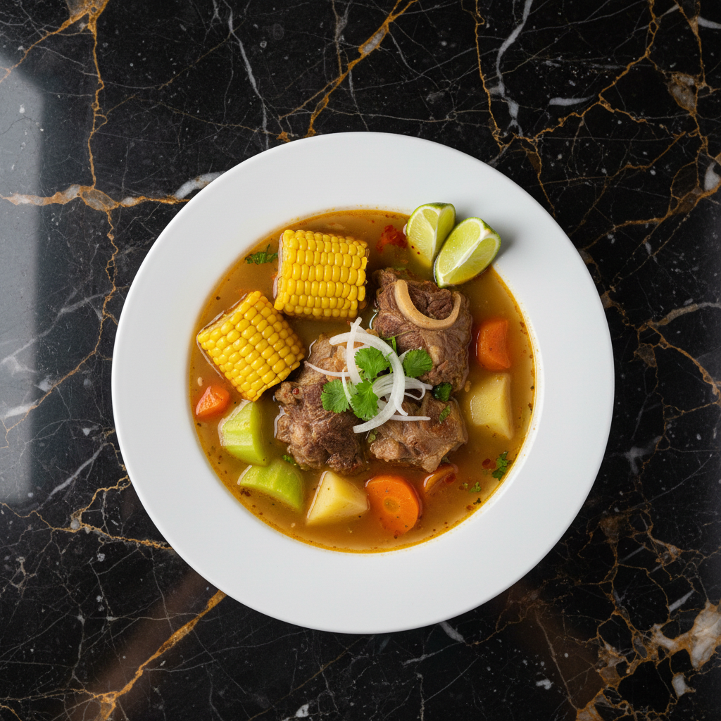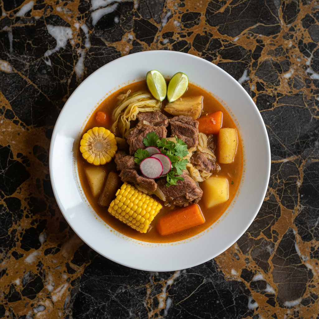 A hearty and flavorful Mexican beef soup, traditionally enjoyed on Sundays with family. This comforting stew features tender beef shank simmered with a medley of vegetables like corn, potatoes, chayote, carrots, and cabbage, all infused with aromatic herbs.
