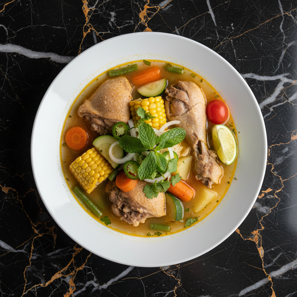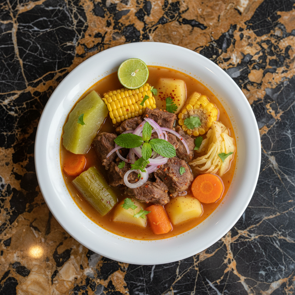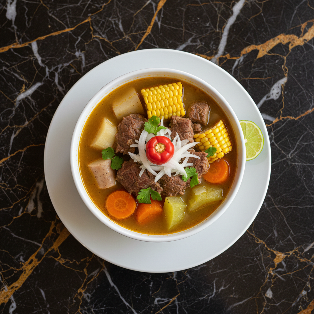 A hearty and flavorful Mexican beef soup, traditionally enjoyed on Sundays with family. This comforting stew features tender beef shank simmered with a medley of vegetables like corn, potatoes, chayote, carrots, and cabbage, all infused with aromatic herbs.