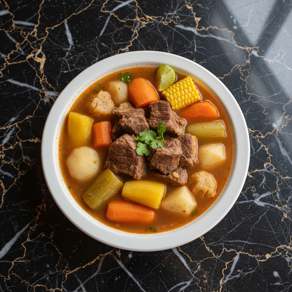 A hearty and comforting beef soup, deeply flavorful with a variety of root vegetables, showcasing the rustic heartiness of Costa Rican home cooking.