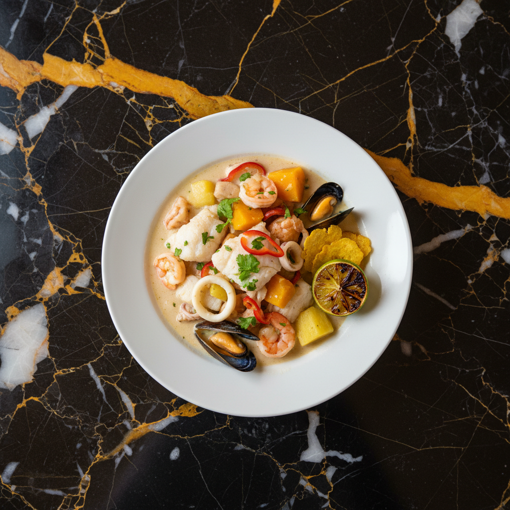A rich and comforting Puerto Rican seafood stew, traditionally prepared during Lent, featuring a creamy coconut broth with an assortment of fish, shellfish, and root vegetables.