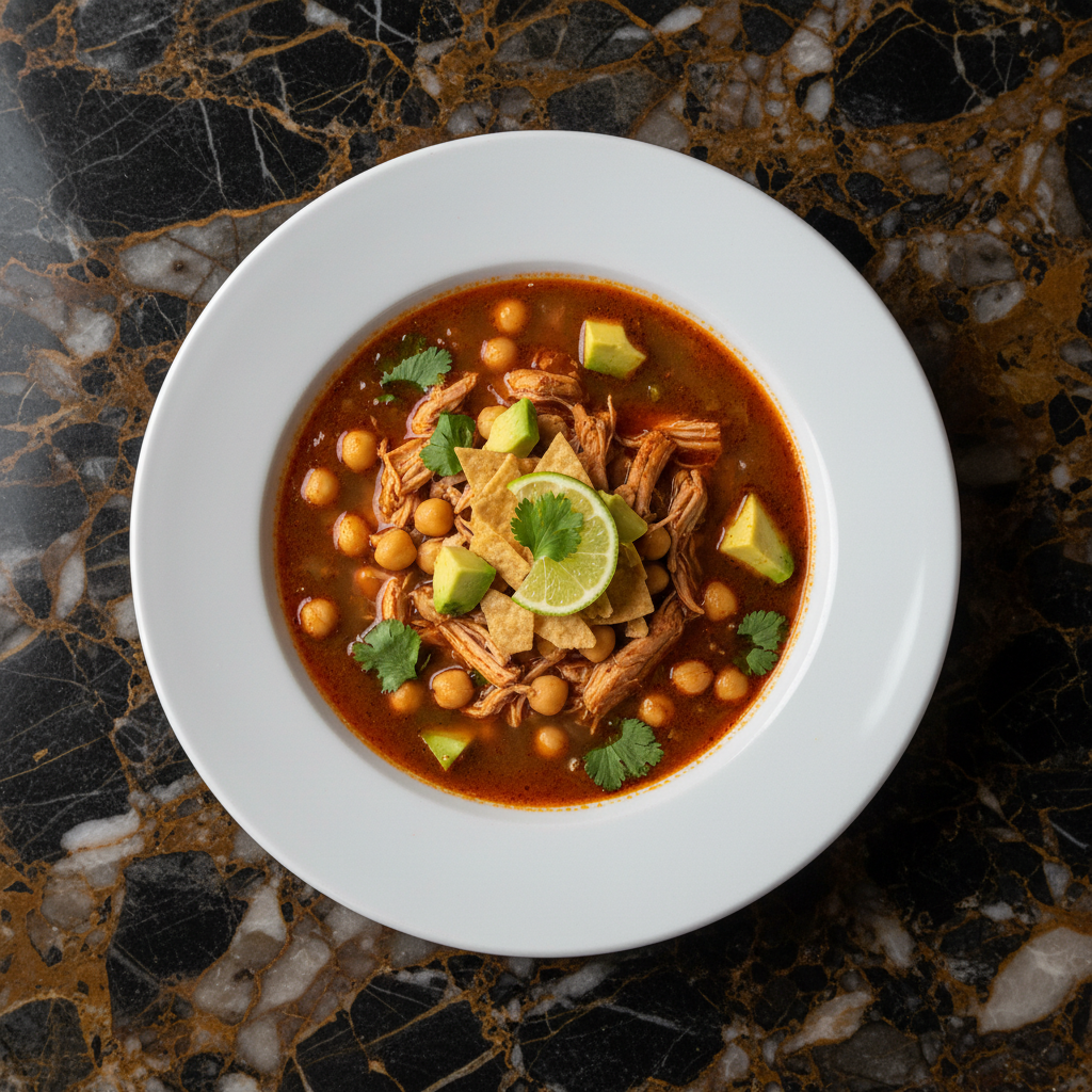 A hearty and flavorful Tlalpan-style chicken soup, featuring tender chicken, chickpeas, smoky chipotle peppers in adobo, and fresh avocado. Named after the historic borough of Tlalpan in Mexico City.