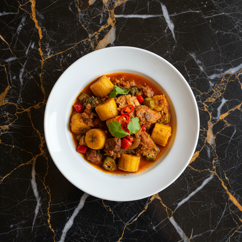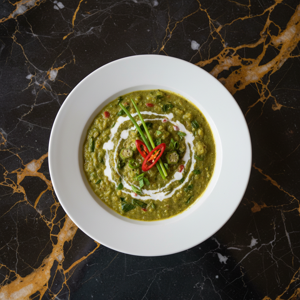 A rich and creamy soup or stew made primarily from dasheen leaves (taro leaves), okra, coconut milk, and seasoned with aromatic vegetables and spices. It's a staple in Trinidadian cuisine.