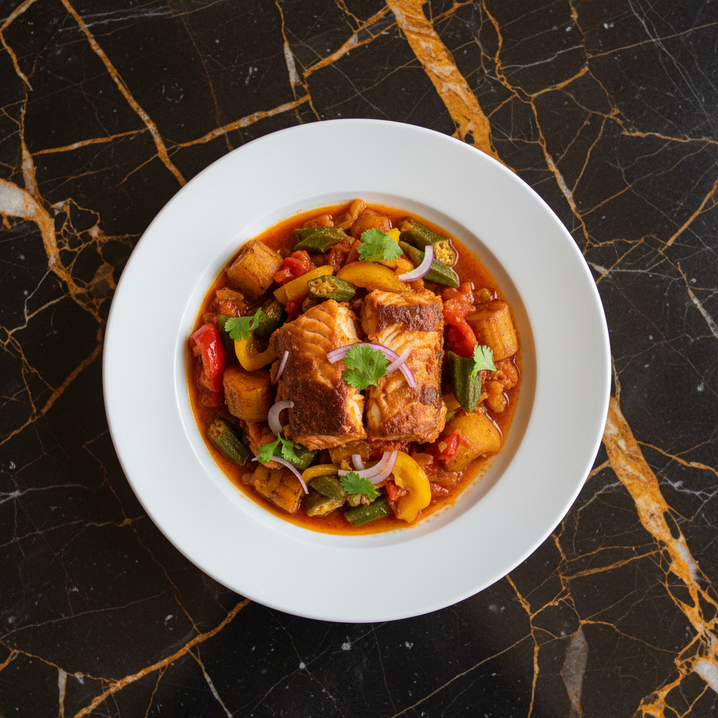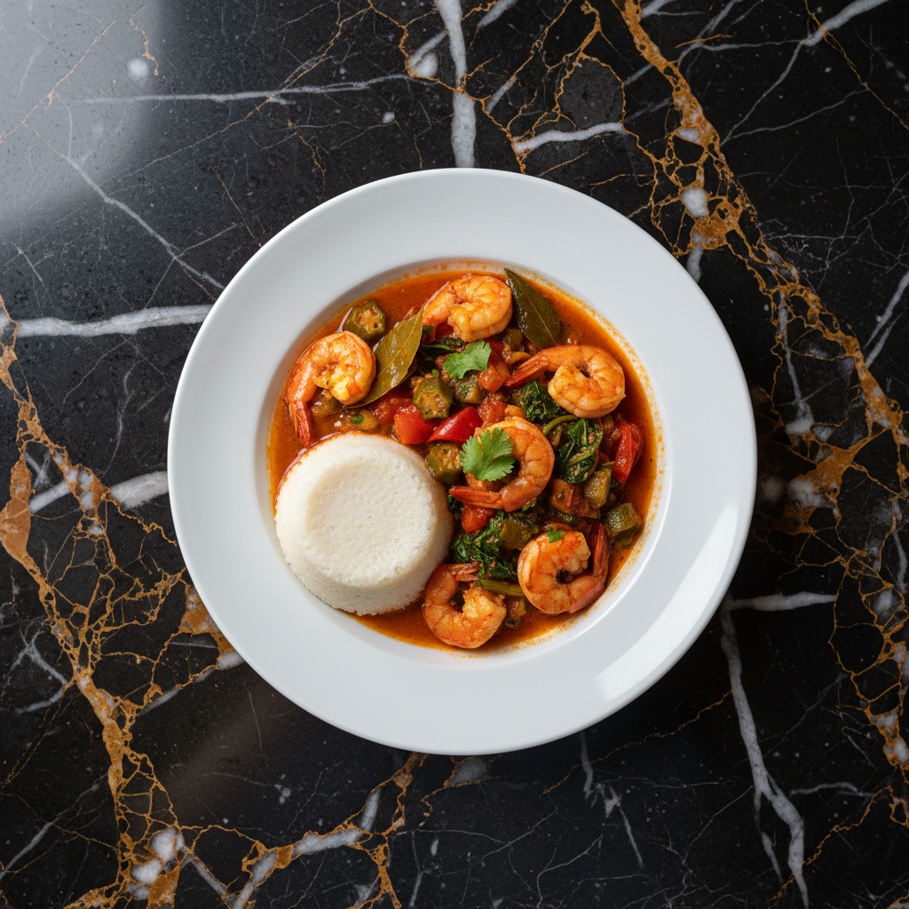 A flavorful Angolan stew featuring shrimp cooked with a variety of vegetables, palm oil, and spices. It's a rich and savory dish often served with funge or rice.