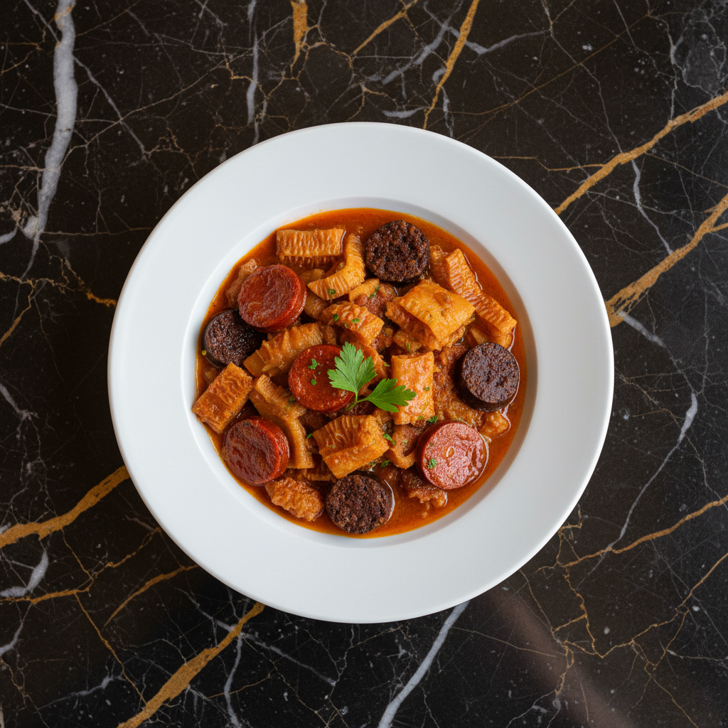 A classic Madrid stew featuring tender beef tripe slow-cooked with smoky chorizo, rich morcilla (blood sausage), and a paprika-infused tomato sauce, enriched with tender chickpeas. This is a hearty and traditional dish, perfect for a comforting meal.