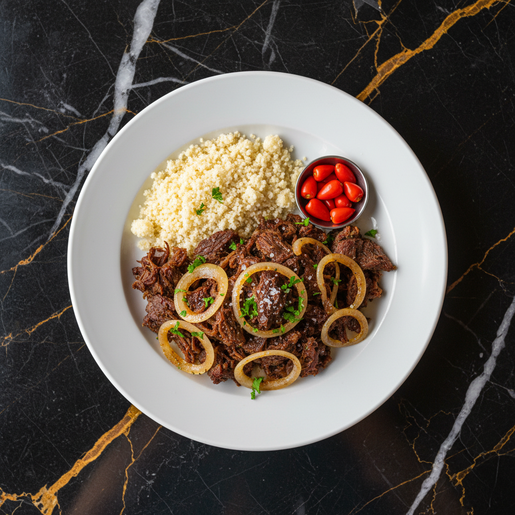 A classic Brazilian comfort food, Carne Seca Acebolada features tender, shredded salted dried beef (carne seca) slow-cooked and then sautéed with sweet, caramelized onions. This dish is deeply savory and satisfying, perfect served with rice and beans.