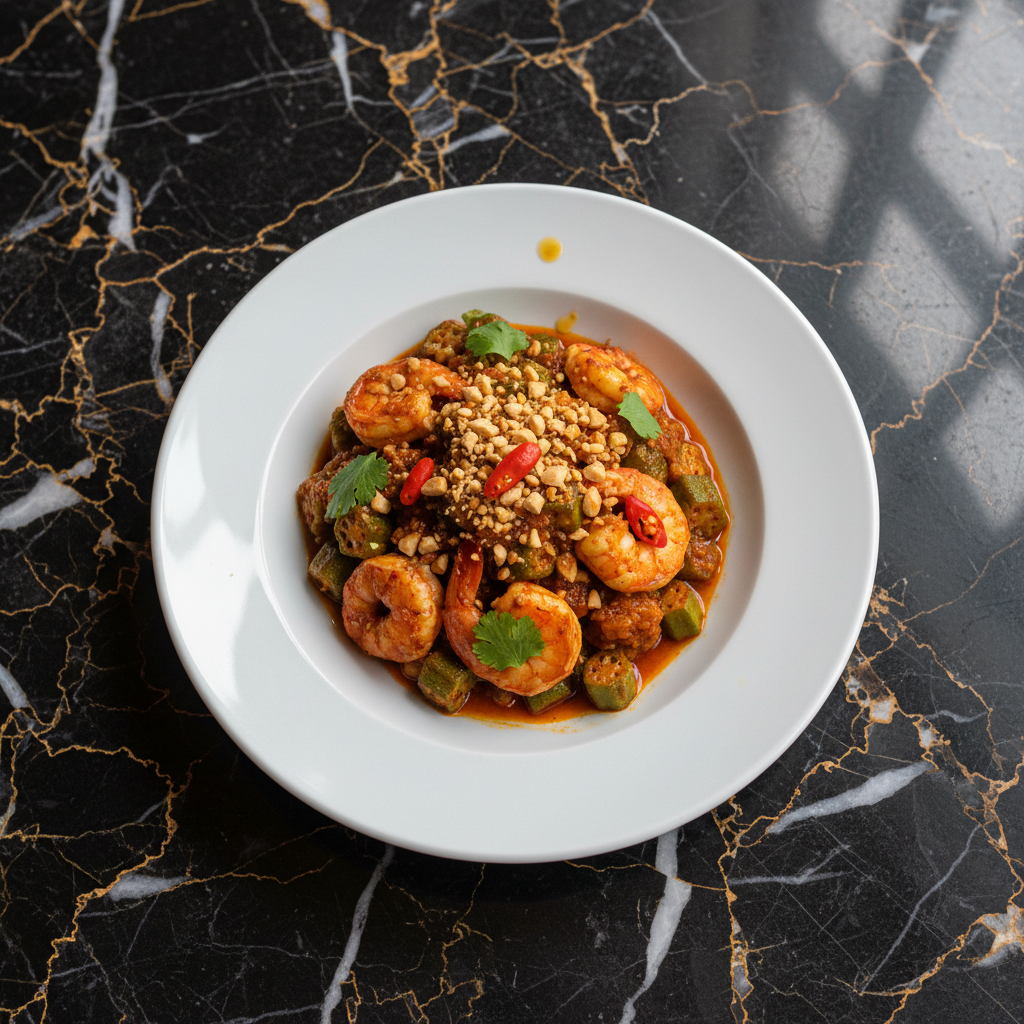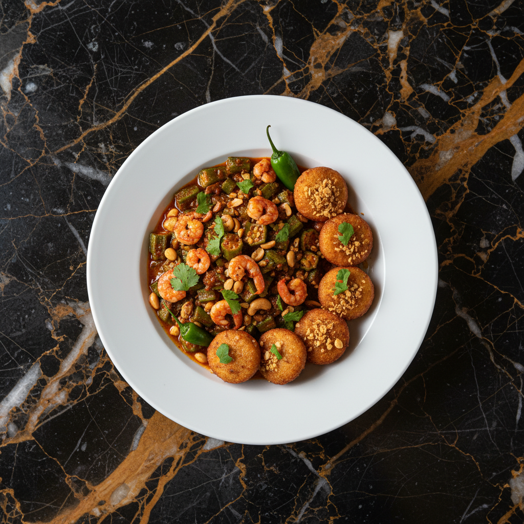 A traditional Bahian okra stew, often prepared as a sacred offering in Candomblé ceremonies. This rich and flavorful dish combines tender okra with savory dried shrimp, creamy cashews, and the distinctive aroma of dendê oil.