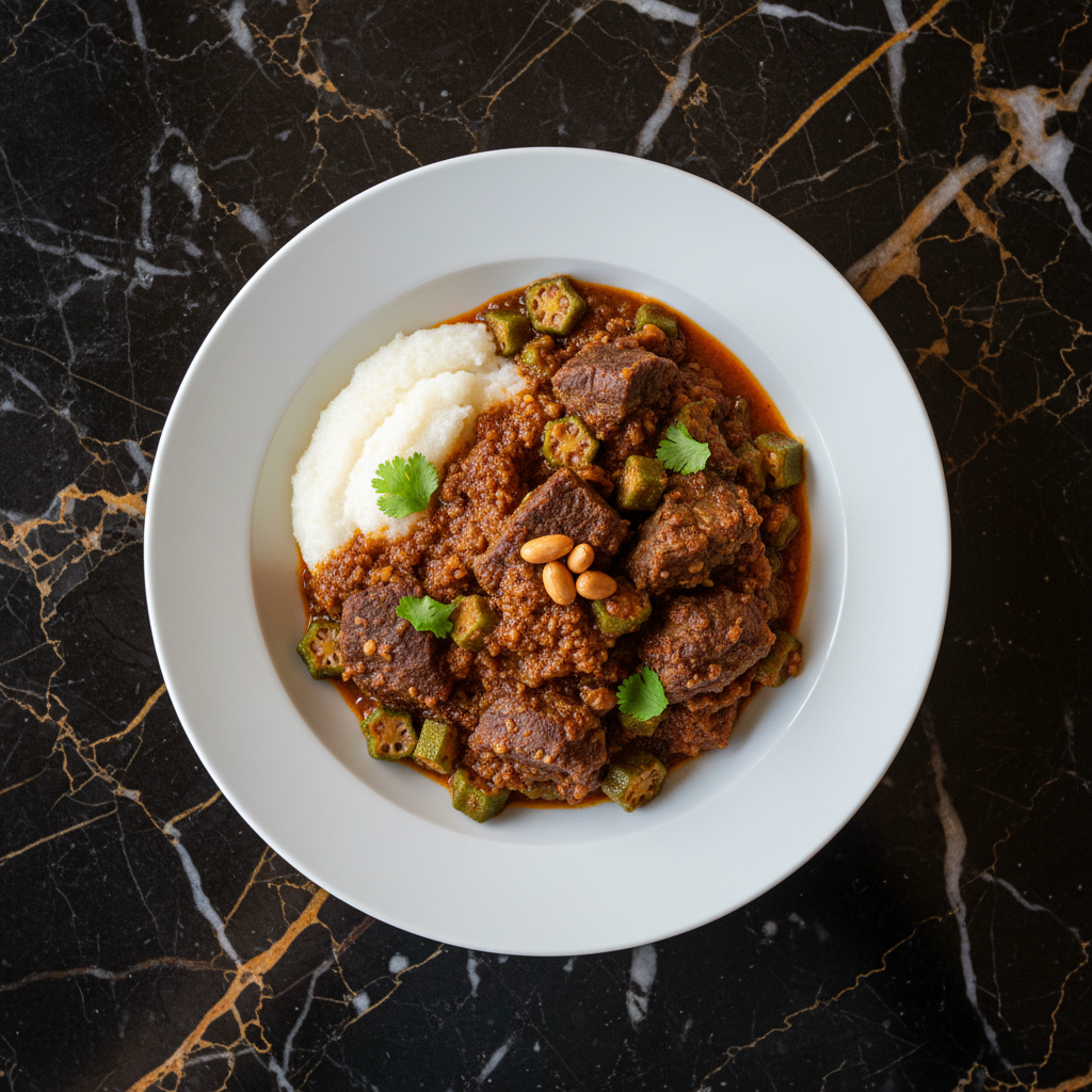 A rich and savory beef stew, slow-cooked with okra and ground peanuts (ginguba), creating a thick, flavorful sauce that is a staple in Angolan homes.