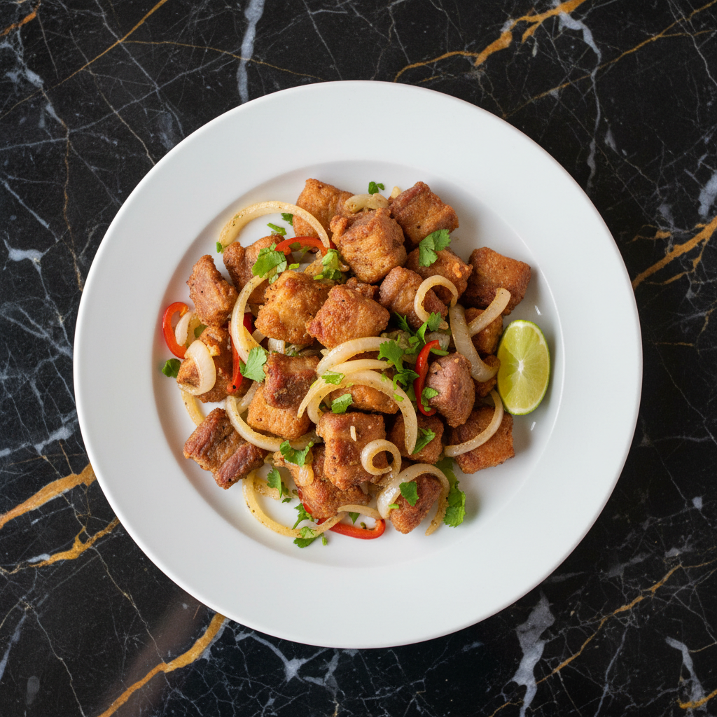 Crispy, savory chunks of seasoned pork fried to perfection and tossed with sweet, slightly caramelized onions. This dish is a beloved classic, often served as an appetizer or a main course with traditional sides.