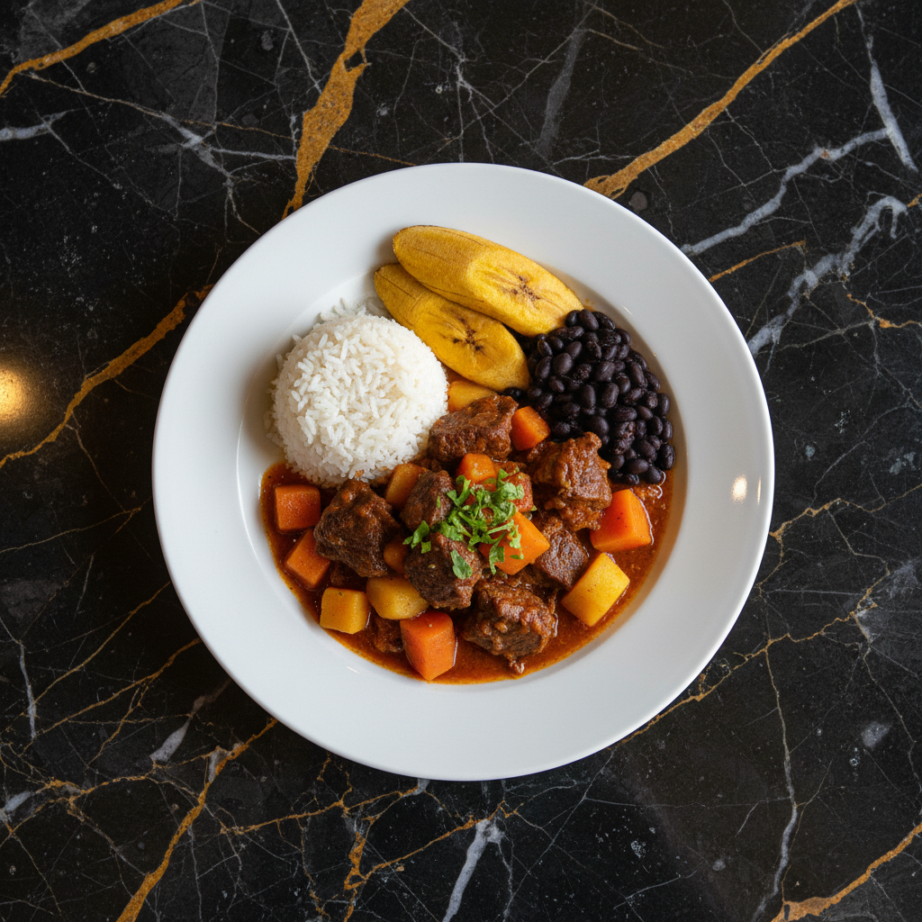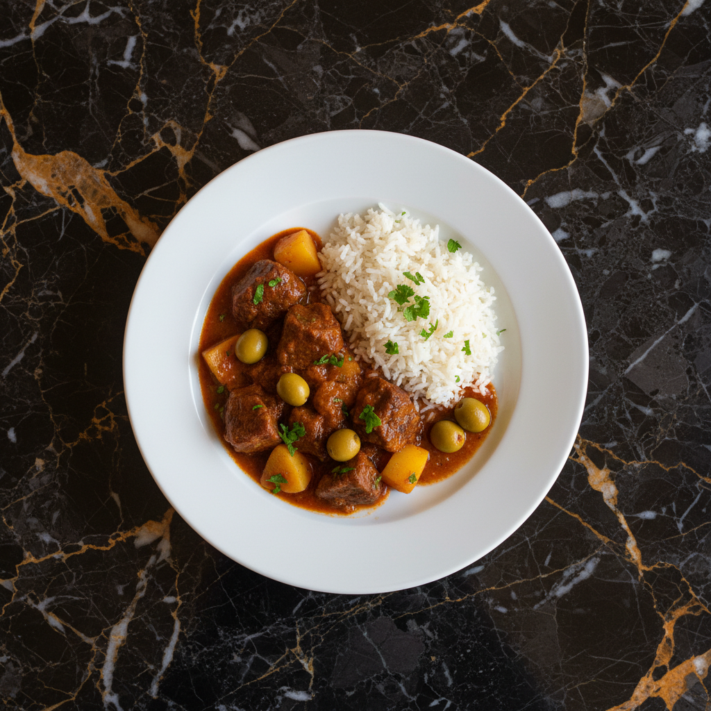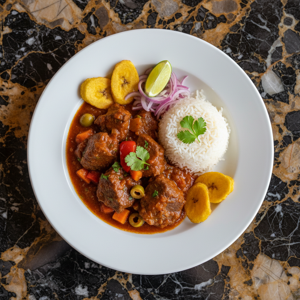 A hearty and flavorful Dominican-style beef stew, slow-cooked until tender in a rich tomato-based sauce with aromatic spices and vegetables.