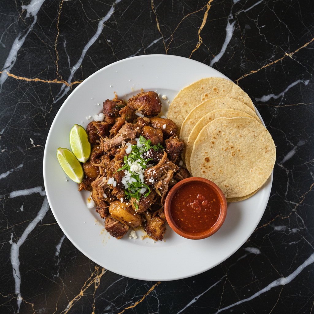 Authentic Michoacán-style carnitas, where pork shoulder is slowly confited in its own rendered fat until incredibly tender and then crisped to perfection. This is the ultimate taco filling, a true taste of Mexican culinary tradition.