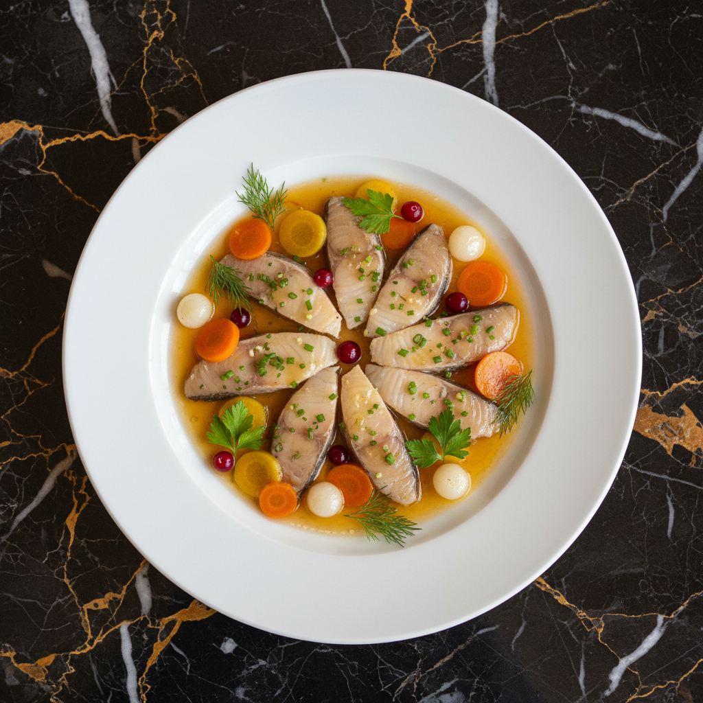 A classic Alsatian Jewish Shabbat and Rosh Hashanah dish. Whole carp is gently poached in a flavorful court-bouillon, then chilled in the resulting gelatinous broth until set. The dish is served cold, allowing the natural collagen from the fish to create a delicate jelly, offering a unique sweet and sour flavor profile.