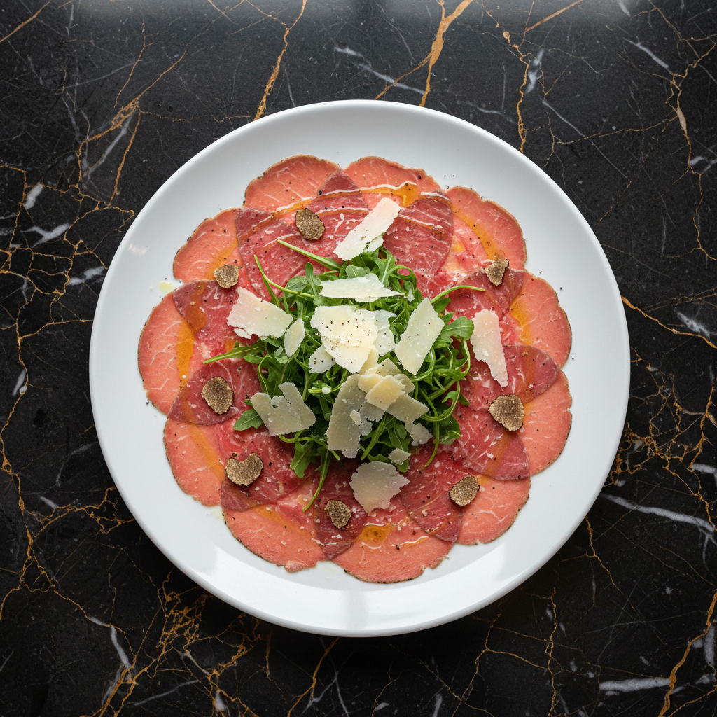 A classic Italian appetizer featuring paper-thin slices of raw beef tenderloin, dressed simply with peppery arugula, shavings of salty Parmigiano Reggiano, and a bright lemon-olive oil dressing. The optional drizzle of truffle oil adds an earthy, luxurious finish.