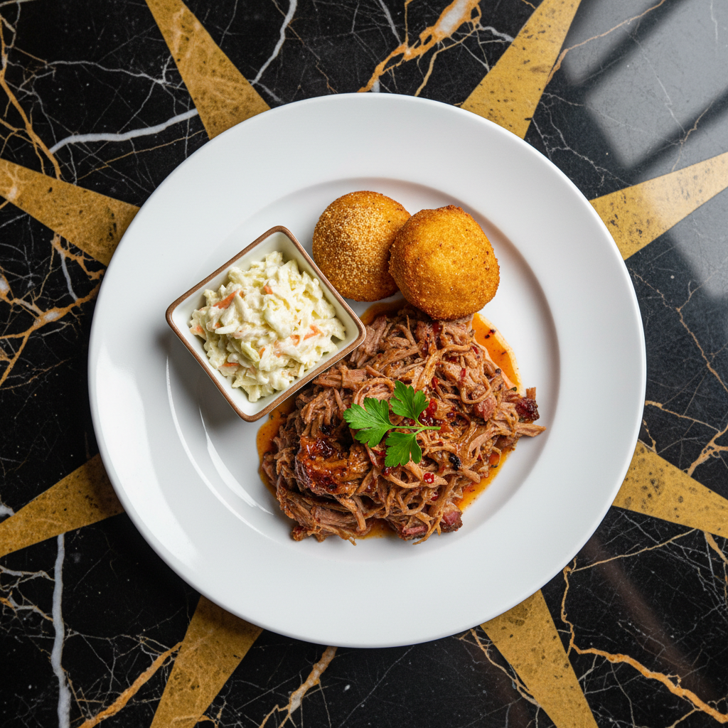 Experience authentic Carolina BBQ with this slow-smoked pork shoulder. The pork is first seasoned generously, then smoked low and slow until incredibly tender. It's then pulled apart and tossed in a tangy, vinegar-based sauce, embodying the classic Eastern North Carolina style. Perfect for gatherings and a true taste of Southern tradition.