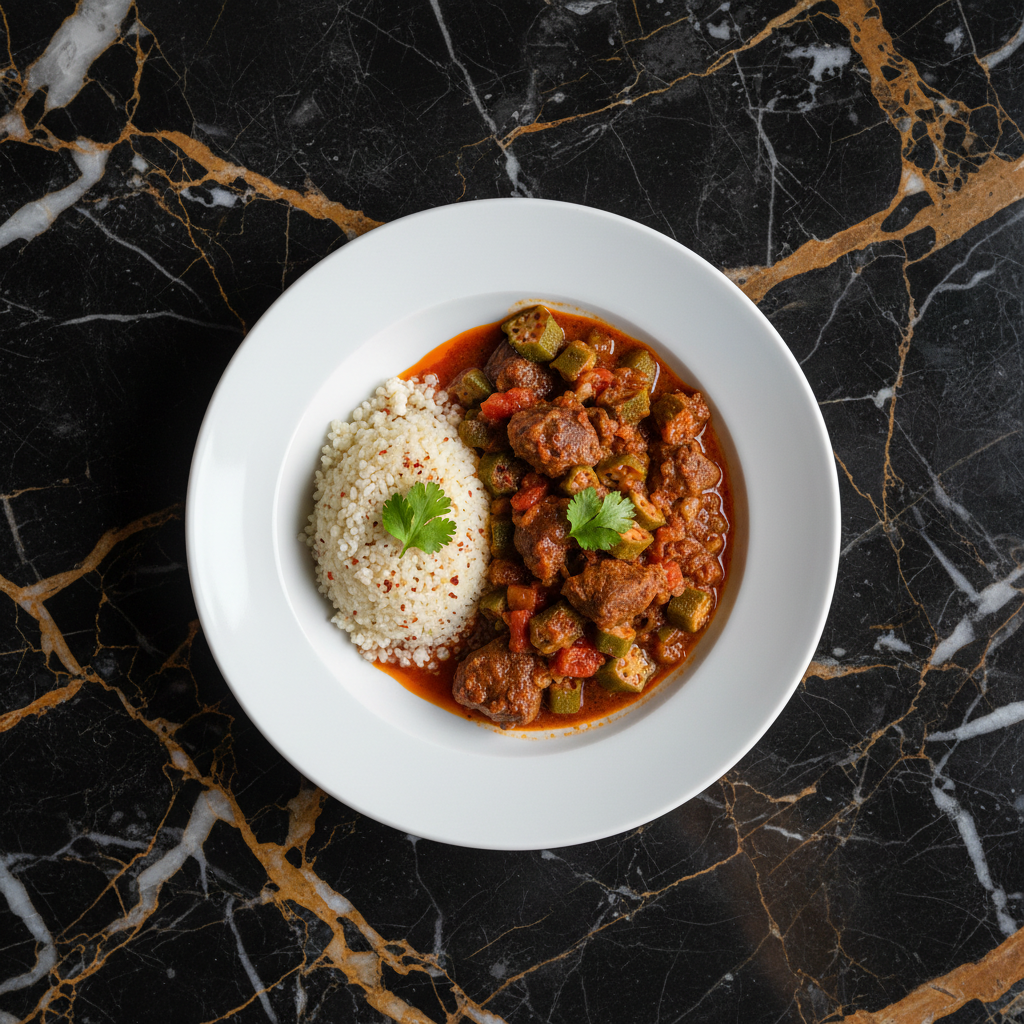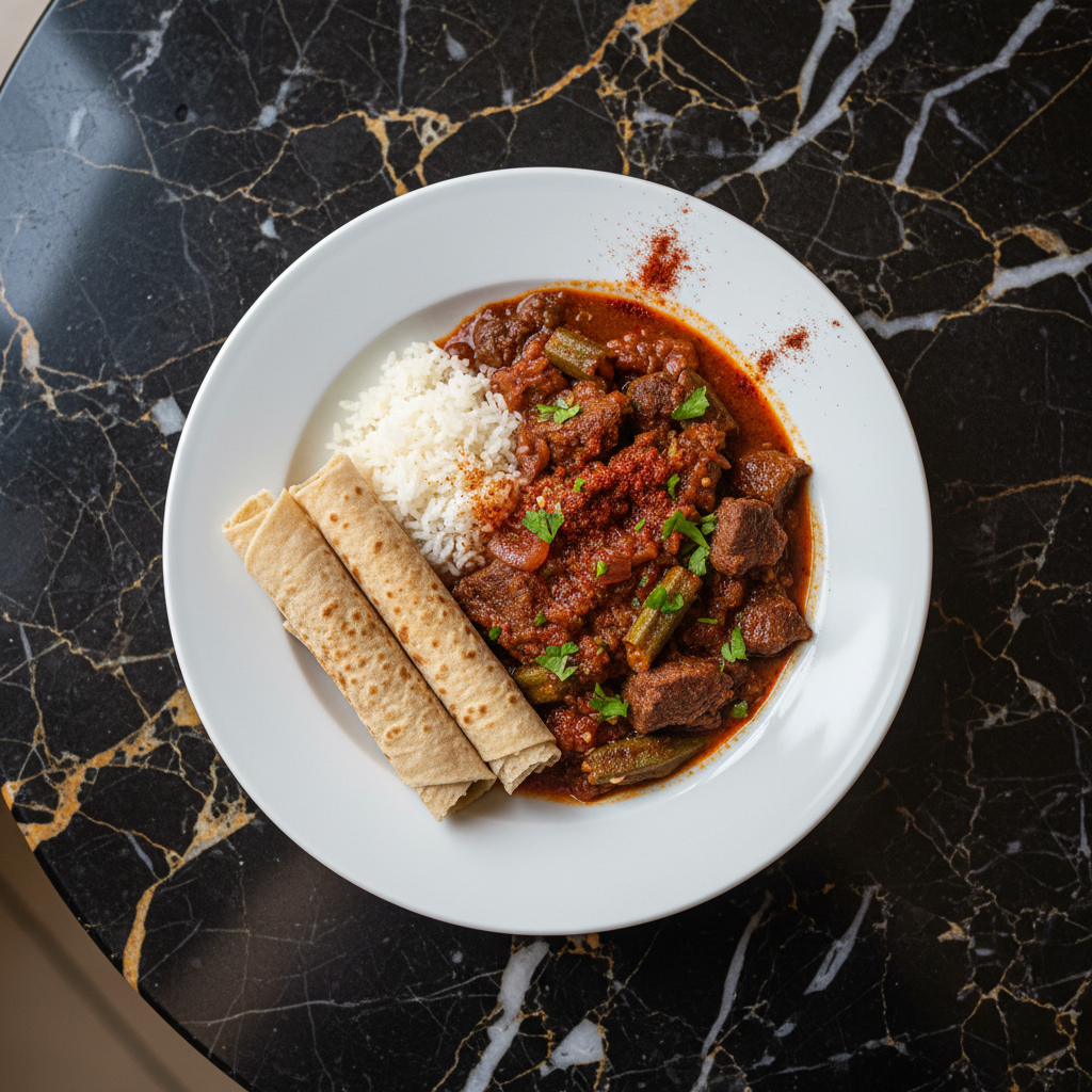 A hearty and flavorful stew made with tender chunks of beef, okra, tomatoes, and aromatic spices, often served with rice or millet.