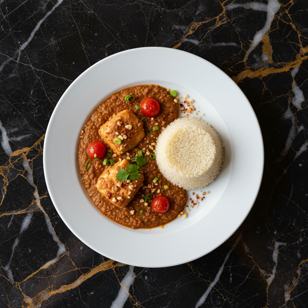 A rich and savory stew made with firm white fish, a creamy peanut butter base, tomatoes, and aromatic spices. It's a hearty and comforting dish, often served with rice or millet.