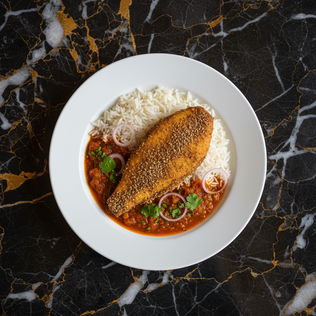 A flavorful and aromatic dish featuring pan-fried or baked fish served with fluffy rice and a vibrant, spiced tomato and onion sauce. This recipe highlights the use of common Chadian spices and fresh ingredients.