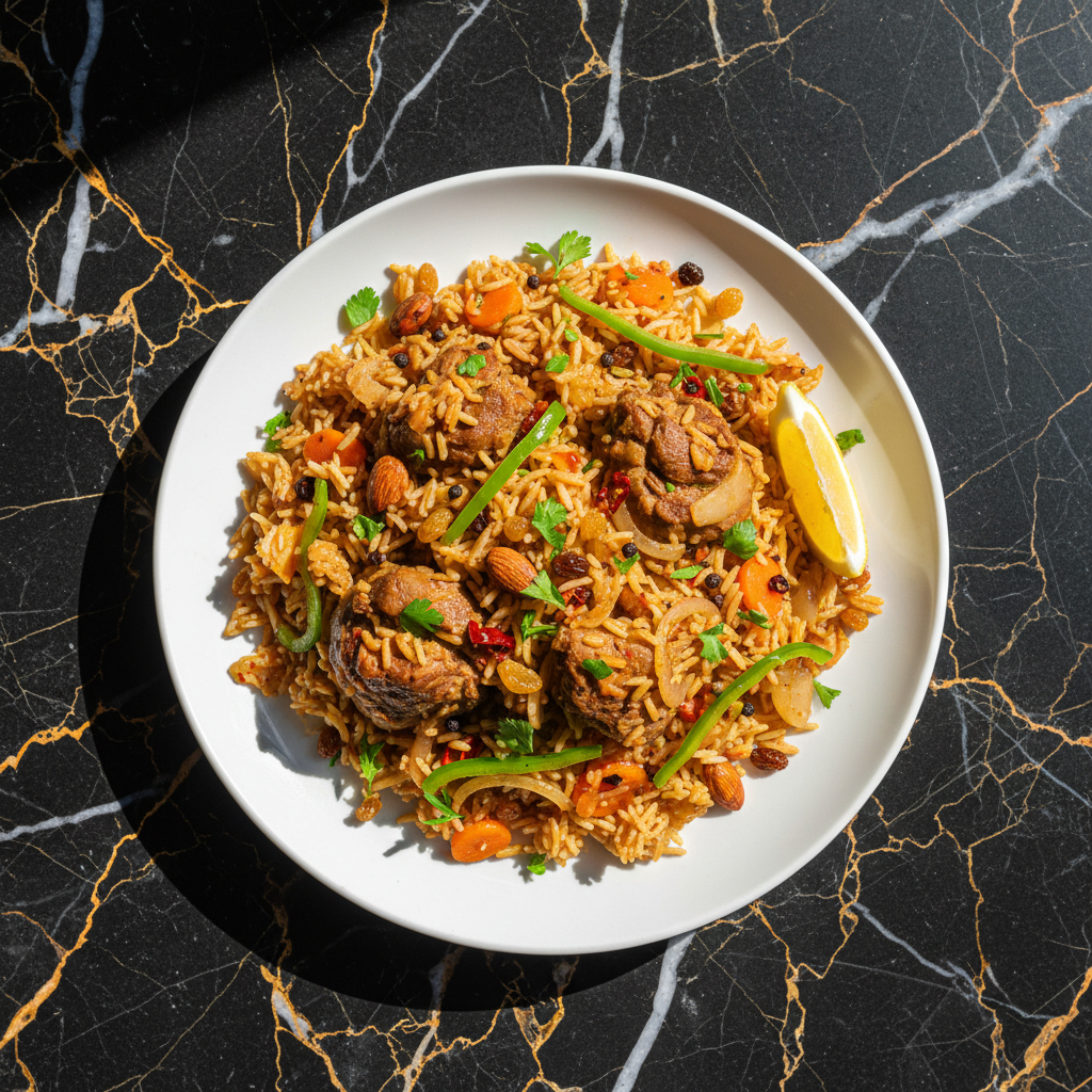 A fragrant and flavorful rice pilaf cooked with tender pieces of lamb, aromatic spices, and vegetables, often served as a celebratory dish.