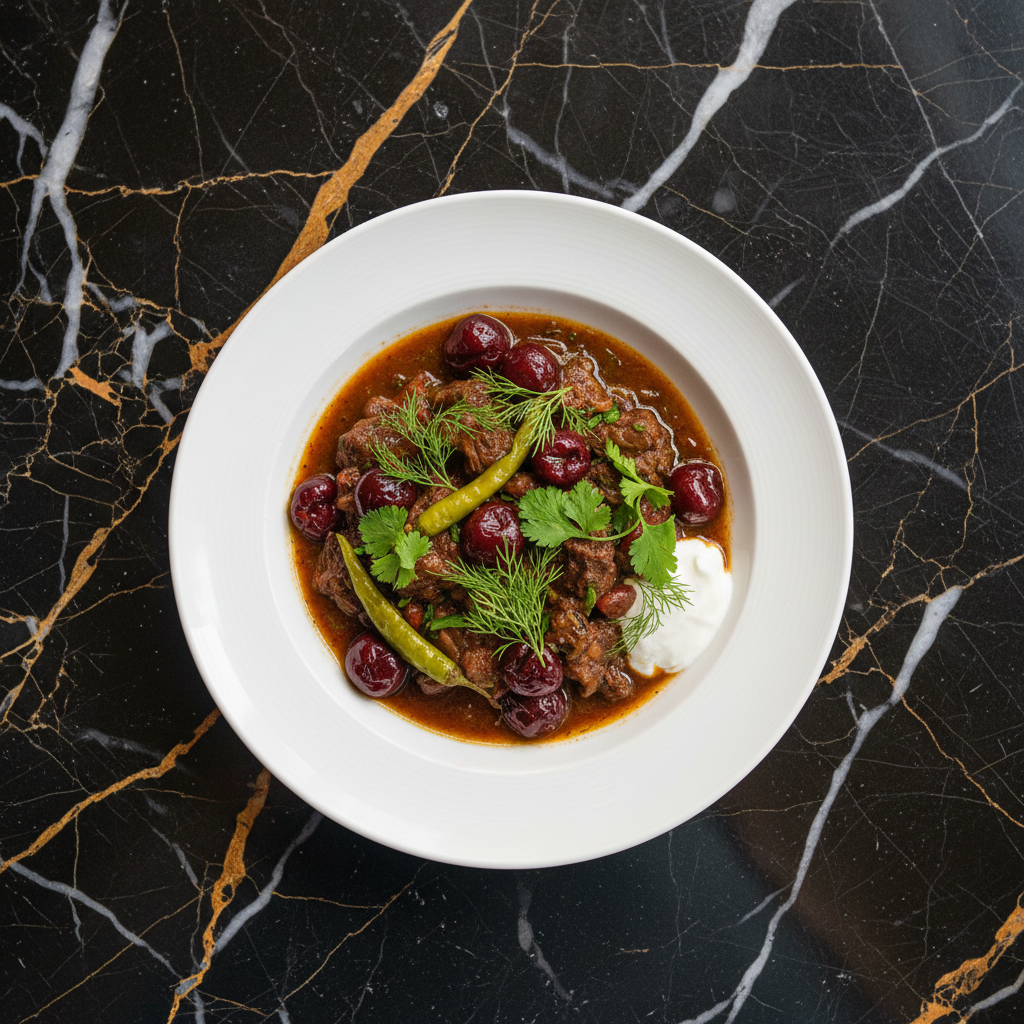 A rich and flavorful beef stew, this Chakapuli variation incorporates the tartness of sour cherries, offering a unique twist on the traditional Georgian dish. Slow-cooked with aromatic herbs and spices, it's a hearty and comforting meal.