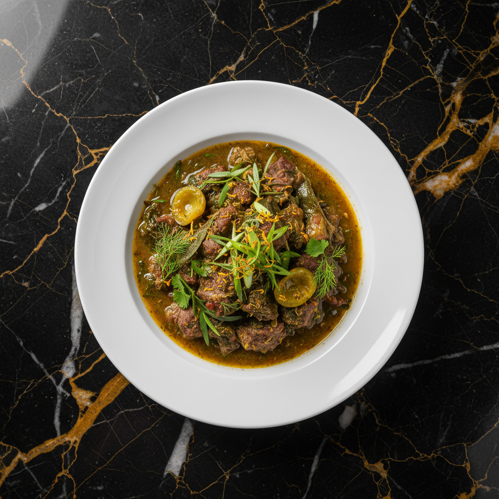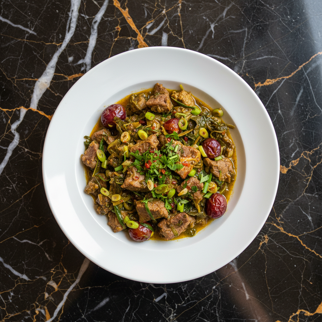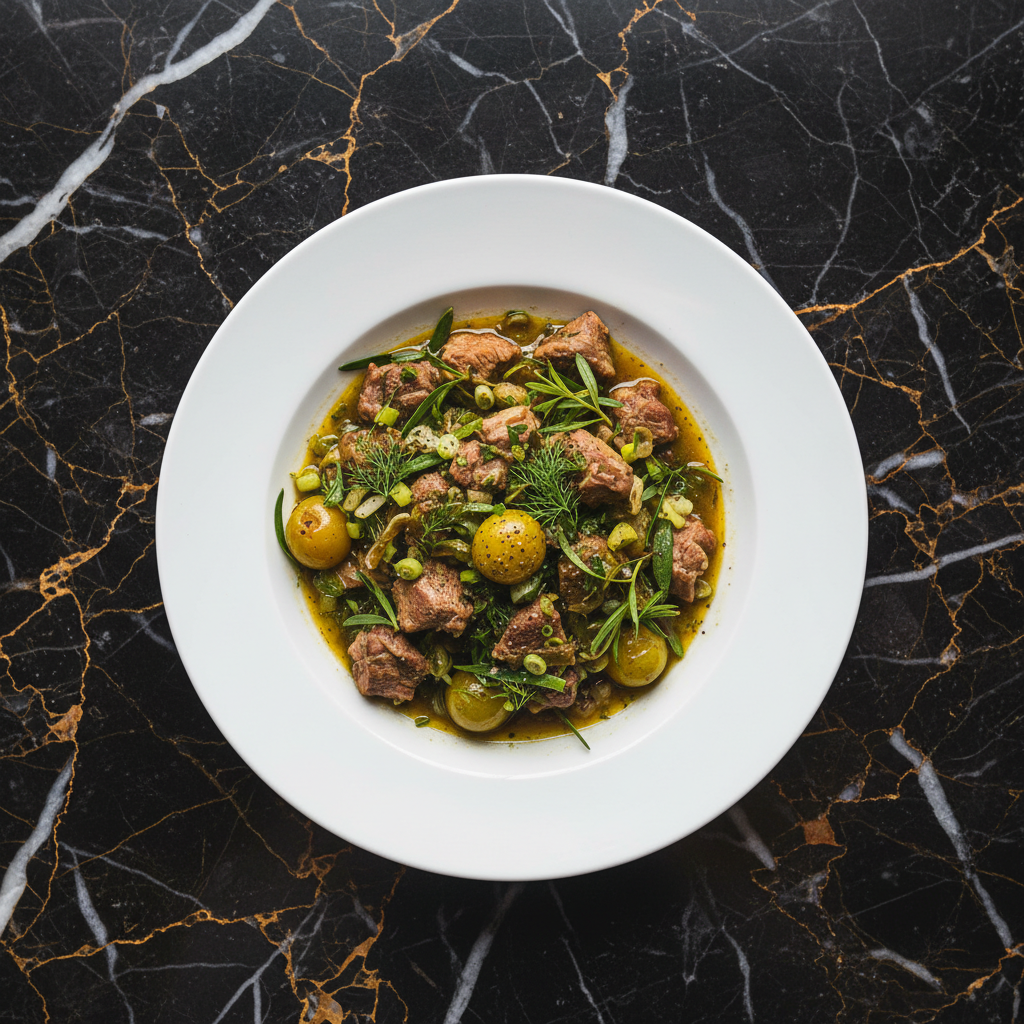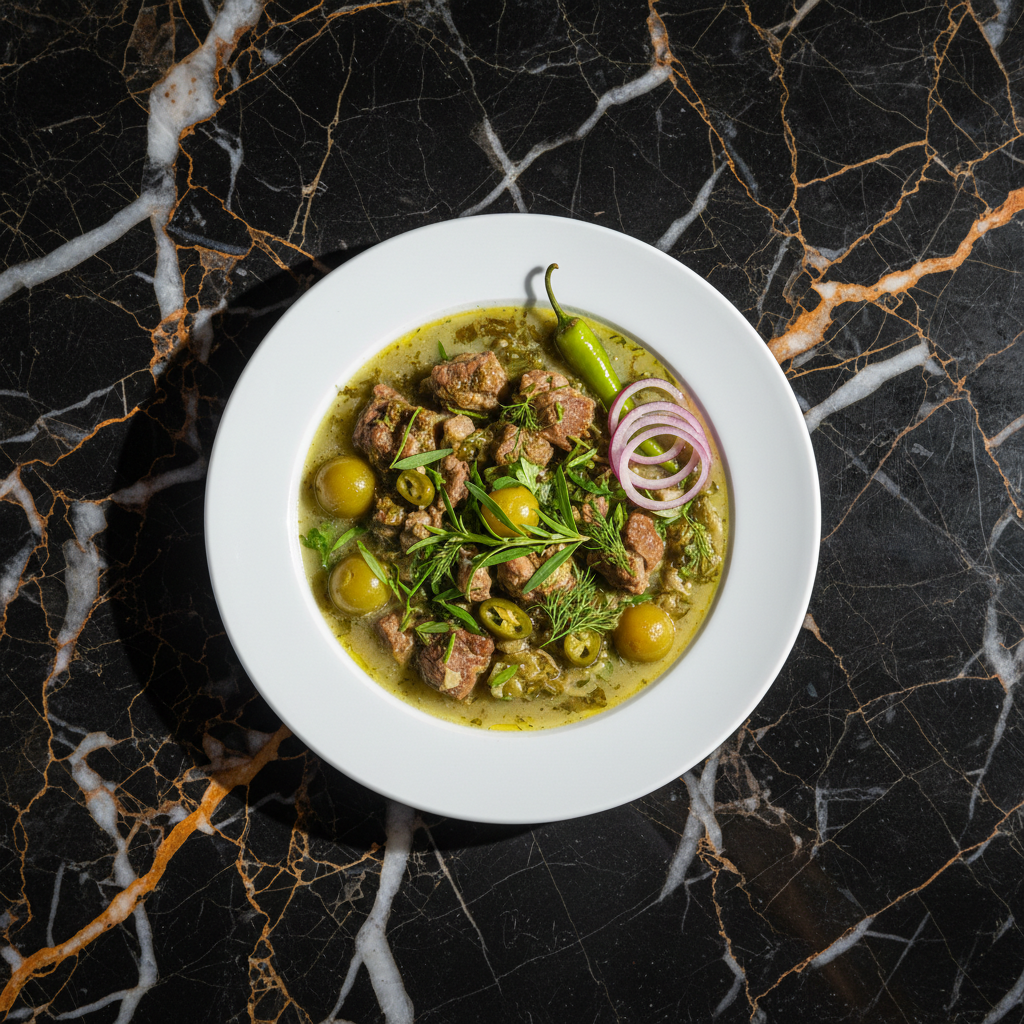 A hearty and flavorful beef stew, a variation of the classic Chakapuli, featuring tender beef simmered with tarragon, sour plums (tkemali), and aromatic herbs.