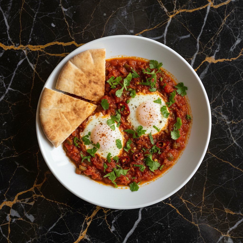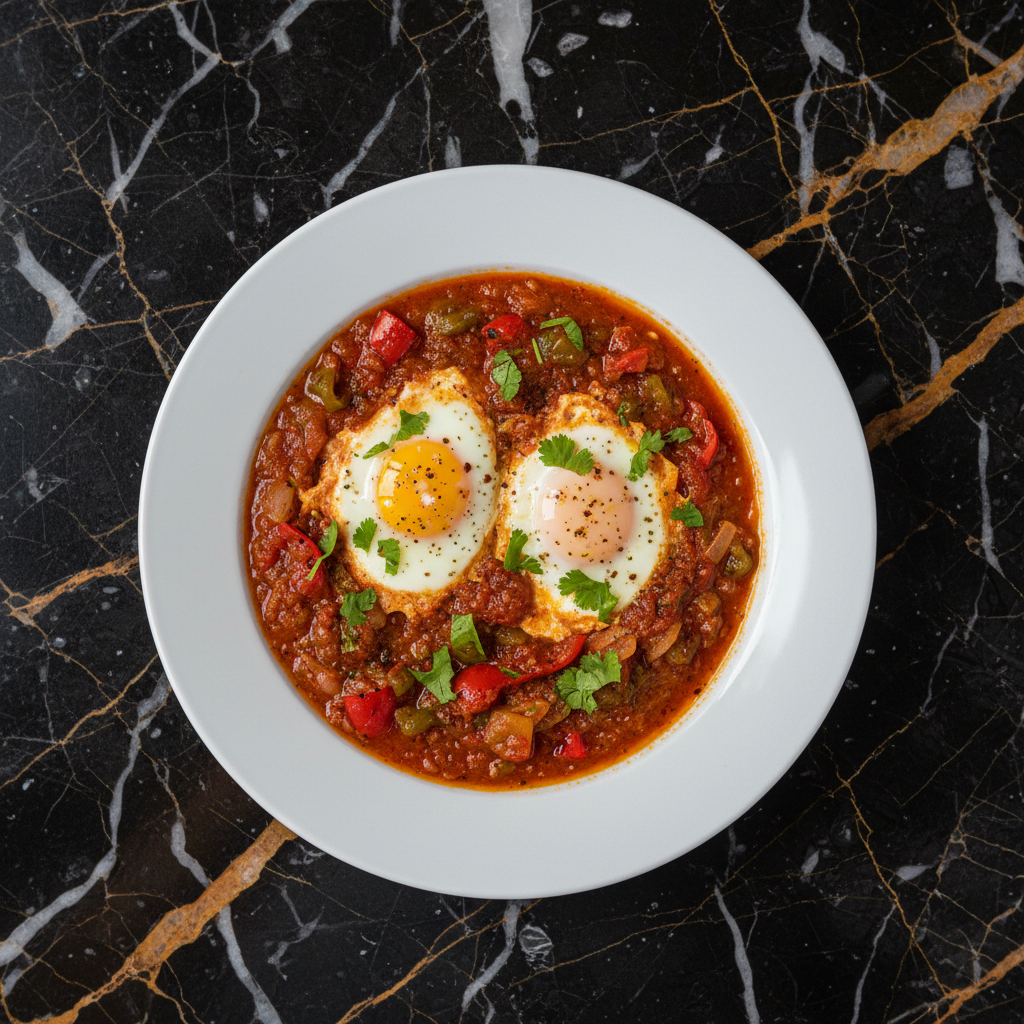 A vibrant and flavorful Moroccan breakfast staple featuring eggs gently poached in a rich, spiced tomato and pepper sauce. Perfect for a hearty start to the day.