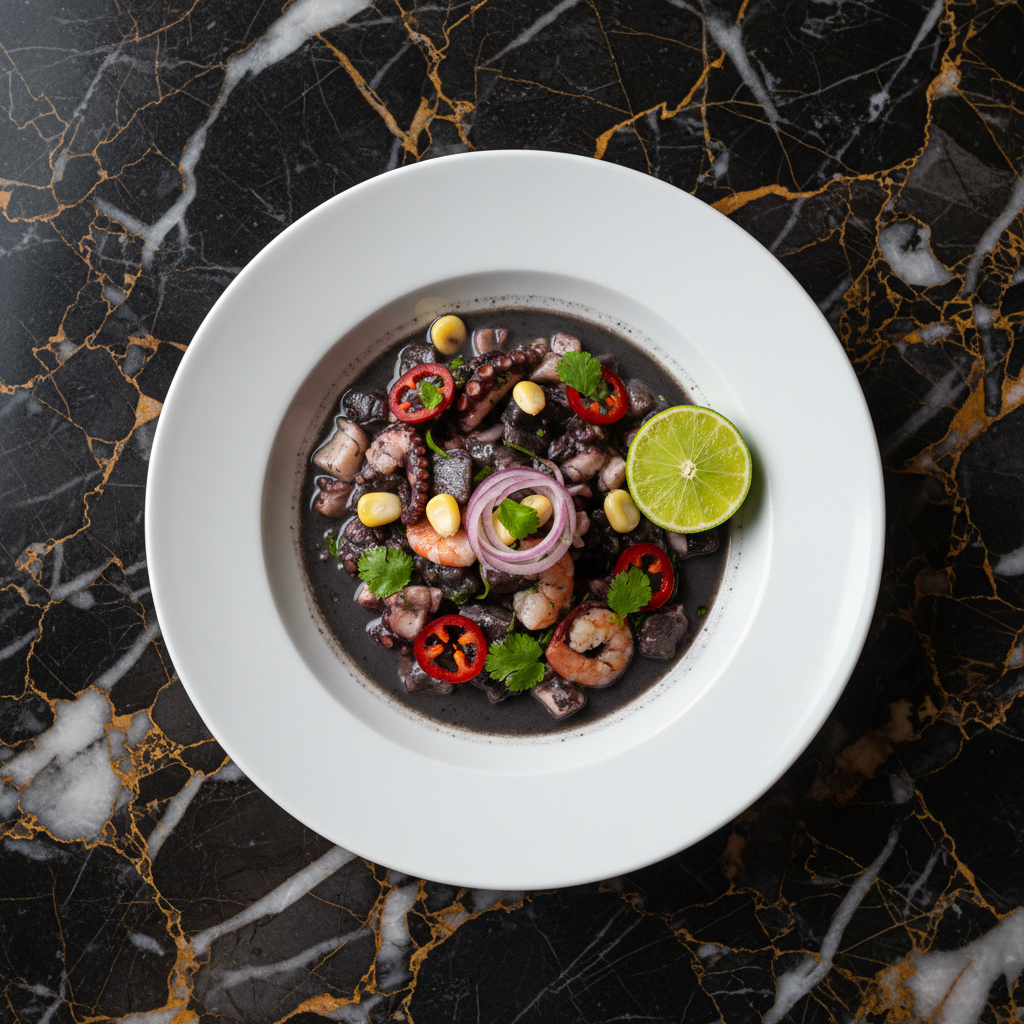 A striking and modern Peruvian ceviche featuring tender seafood cured in a dramatic black 'leche de tigre' infused with squid ink. The vibrant acidity of lime juice, the subtle heat of ají limo, and the fresh aromatics of cilantro create a complex flavor profile.
