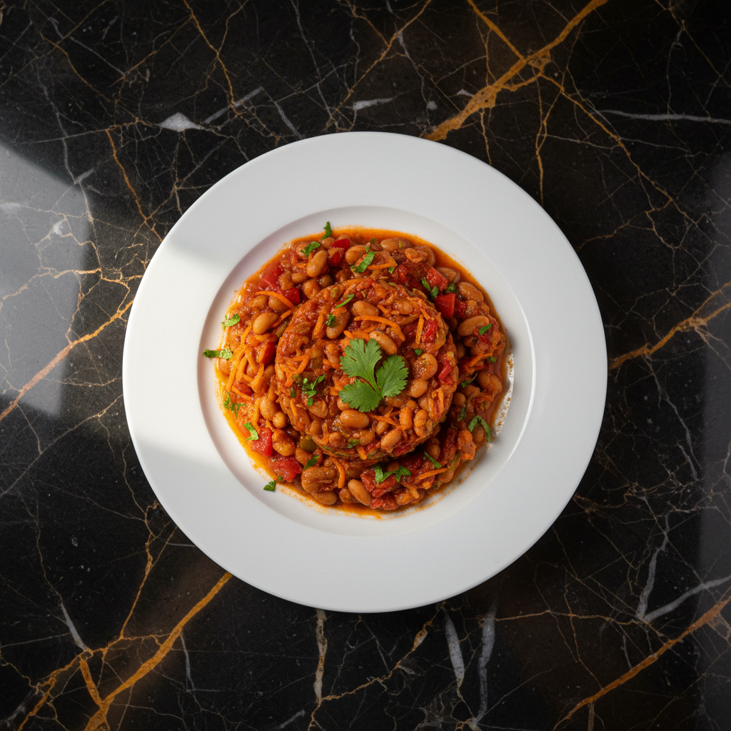 A vibrant and flavorful Tunisian stew of tomatoes, bell peppers, onions, and spices, often topped with poached eggs. This version emphasizes a rich, slow-cooked tomato base with a hint of sweetness and spice.