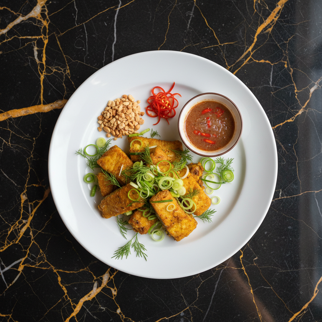 A classic Hanoi street food, Chả Cá Thăng Long features tender white fish marinated in turmeric and spices, pan-fried until golden, and then finished tableside with generous amounts of fresh dill and scallions. It's traditionally served with rice vermicelli, peanuts, and a pungent shrimp paste dipping sauce.