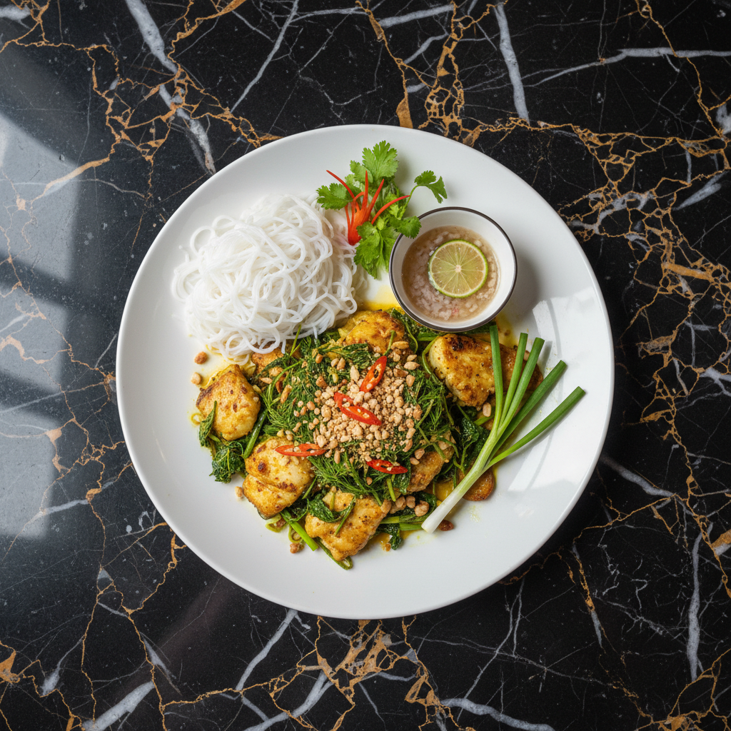 An iconic Hanoi street food dish featuring firm white fish marinated in turmeric and spices, grilled, and then finished tableside with generous amounts of fresh dill and scallions. Served with rice vermicelli, roasted peanuts, fresh herbs, and a pungent shrimp paste dipping sauce.