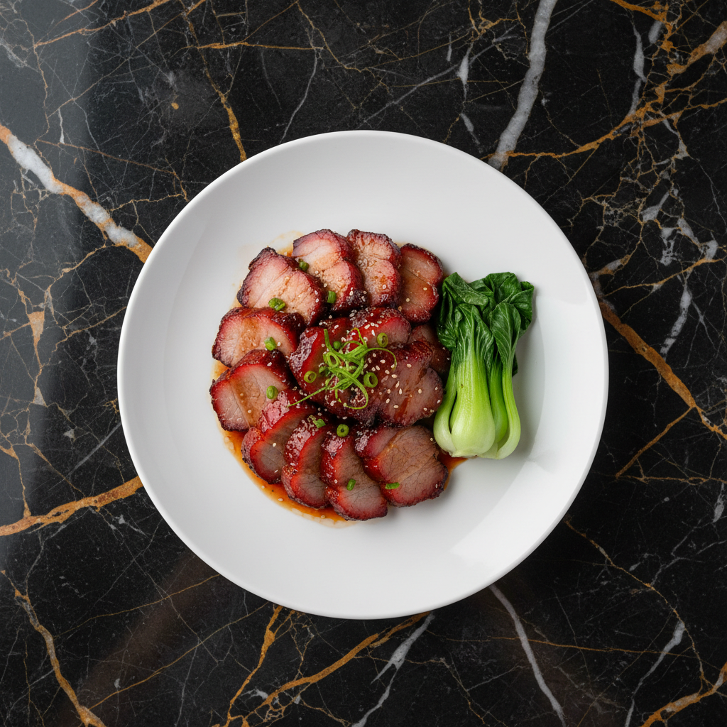 A classic Cantonese BBQ pork, characterized by its glossy, vibrant red lacquer and a delightful balance of sweet and savory flavors. The pork shoulder is marinated in a rich blend of sauces and spices, then roasted to tender, caramelized perfection.